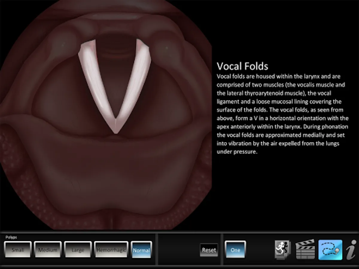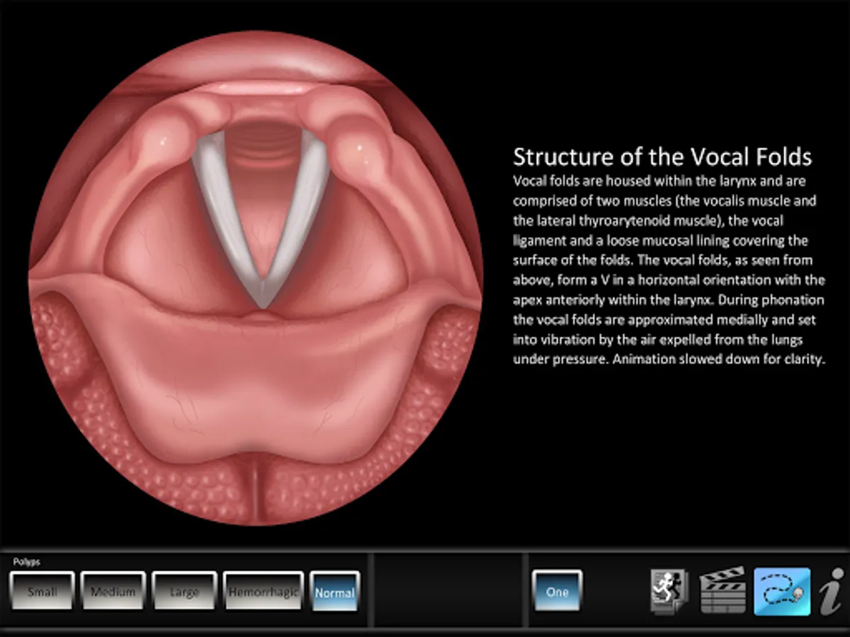 • Zoom and pan all disorder highlights, the normal vocal fold animated illustration & structure ID.