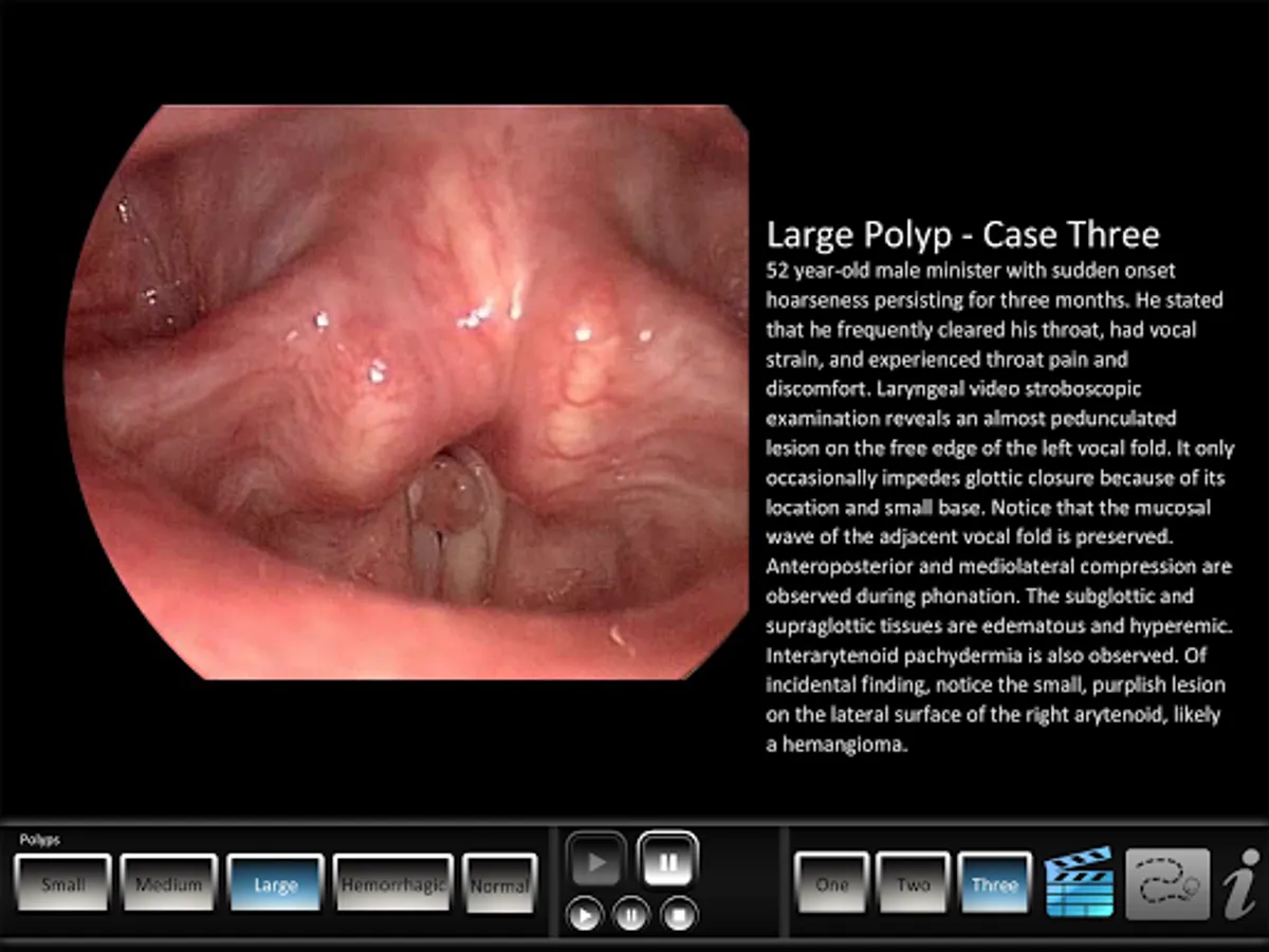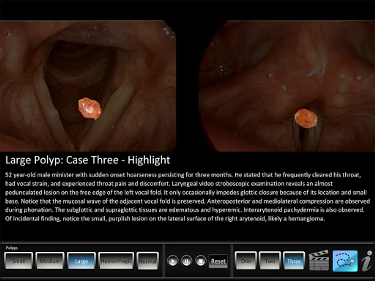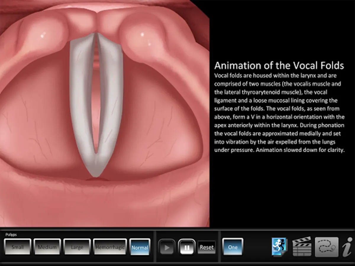 The Vocal Pathology: Polyps app helps students and patients learn and professionals teach vocal pathology. The app features small, medium, large and hemorrhagic videos. Each disorder case includes a key highlight view of abducted and adducted vocal folds. All disorders and normal video include an audio clip of the patient reading the rainbow passage. A normal animated vocal fold illustration, structure ID and three normal videos help patients and students both learn and contrast pathology against normal vocal folds.