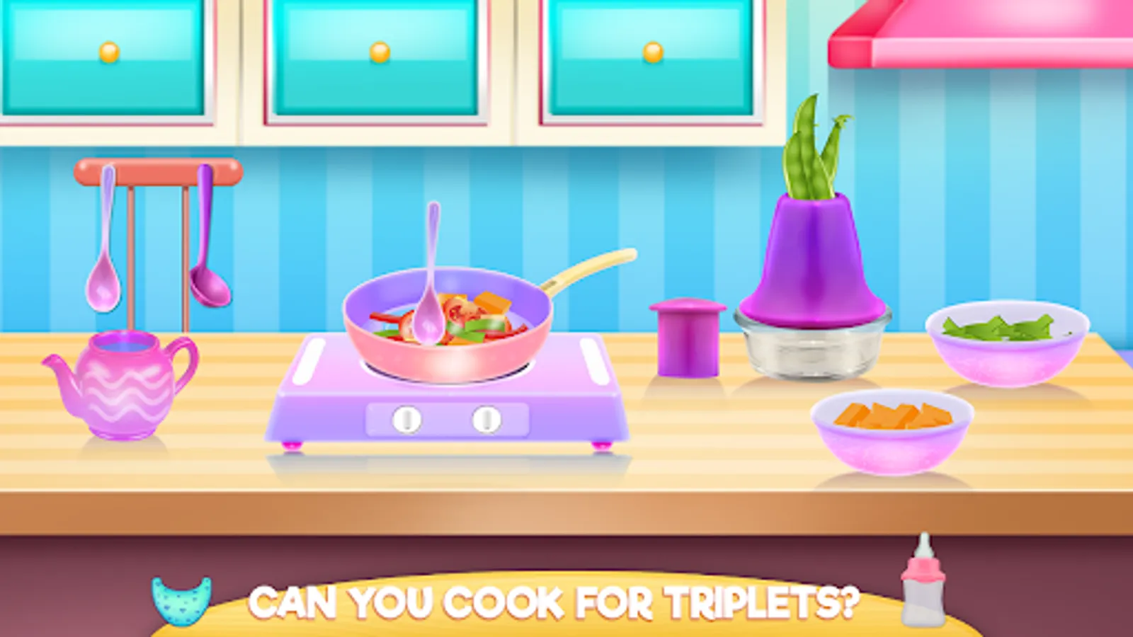 If you think you are a tough cookie try this baby game where you replace a mom that went crazy after endless days of caring, see if you can do it and have fun as well. First comes the feeding and even if the babies are triplets, they have different tastes. So if you cook something veg, the content will be only with vegetables and without any meat, you prepare them and wrap them into a delicious crust. Maybe one of the babies will want the milky food and the other the fruits, that is why you should listen to their needs and make them real. Something cool is that you are making it from the ground and that is how you learn how to make it. Also, you will have a permanent guide during this baby game because each task will be followed by instructions and it's actually easier than in real life because the babies will show you exactly what they will need and when; you just have to pay attention. As you can see in the imaginary bubble of thoughts the babies want to go to the bedroom where you will need to change her diaper with a fresh one but right after you give them a relaxing bath with a lot of play and a good time. Use the shampoo to wash the hair then clean the body and don't forget to play a little bit while you are in the bath to distract them from the real action. When you are done put the triplets to bed and fulfill their needs, they might want to drink a bottle of milk or the nipple or they just want to play until the sleep comes in. This is a full day for a crazy mommy with triplets and if you did it right your babies are now happy asleep.