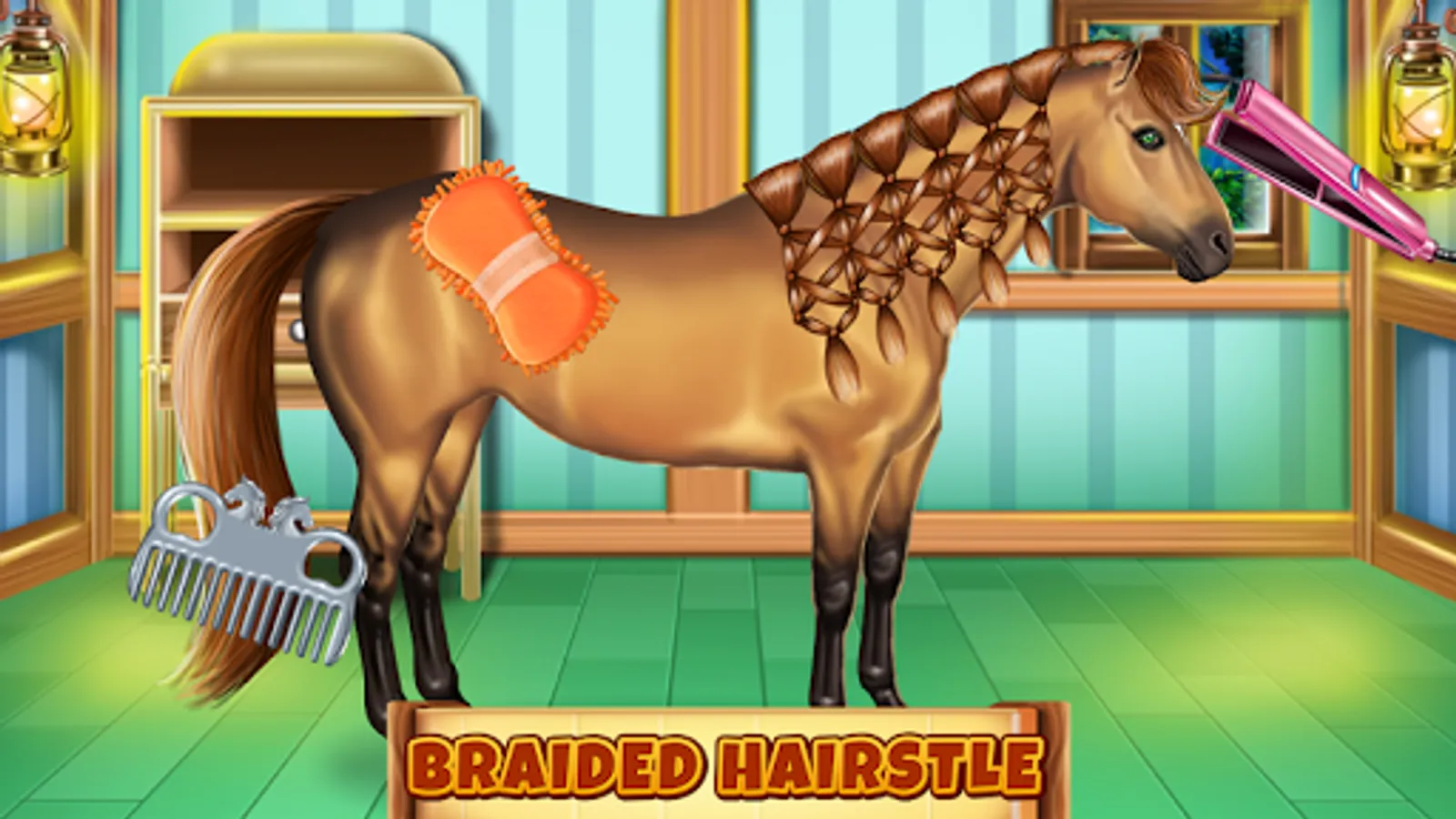 Now comes the styling part of the horse caring game as you will have to use a hair straightener on the horsey in order to get her hair ready for the next step, which will be braiding it. Follow the arrows that will direct your hand gestures and this way you will make her mane look amazing with just a few twists and turns. Once the hair styling processes are all done, then you can enjoy a little game of horse dress up where you can choose some awesome customization items.