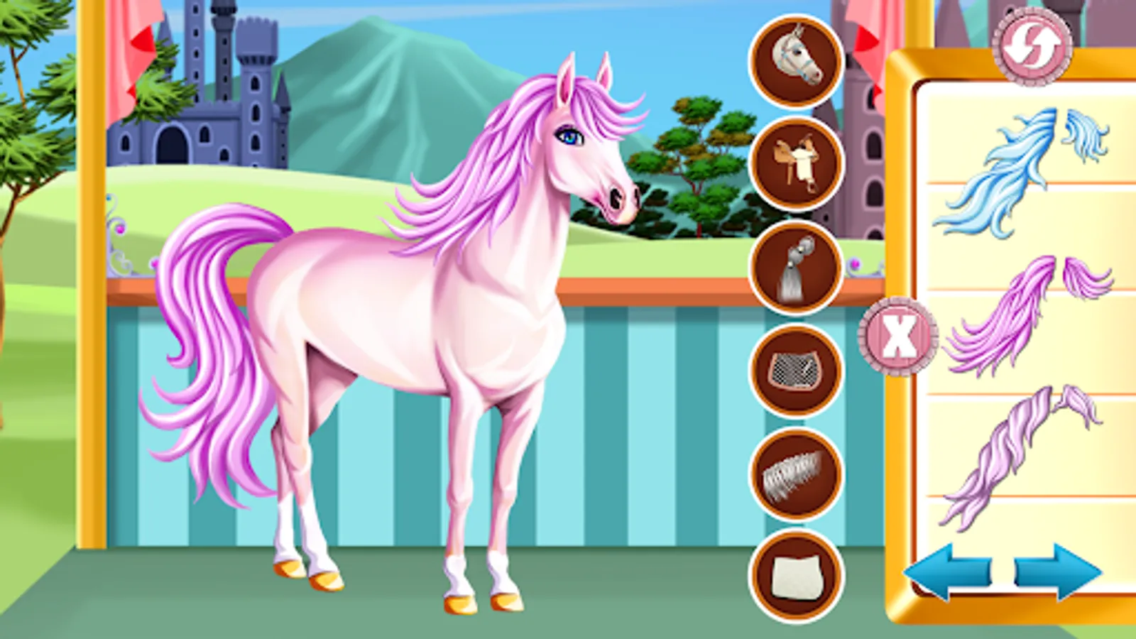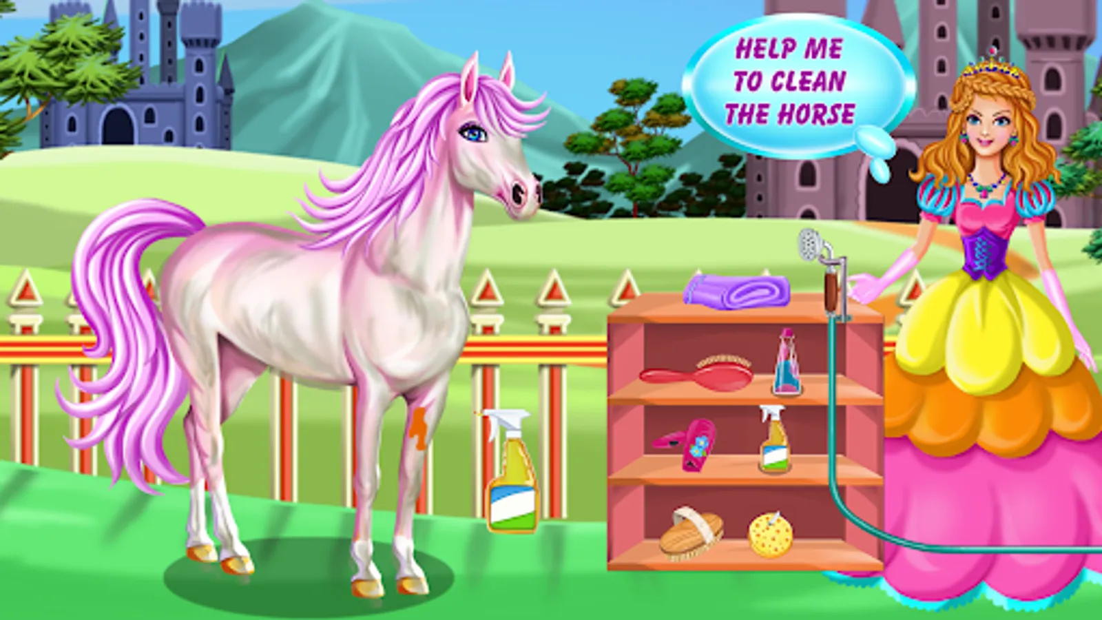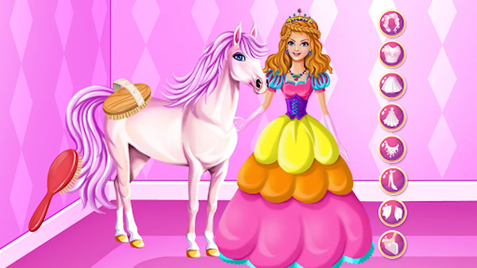 Meet up with the princess in this horse caring game as she has something really special planned for the day. You will get to see what a majestic horse she has and also help her take good care of it. In the first stages of the game you will have to prepare the horse for a dress up game and to do so you will have to first brush his mane.