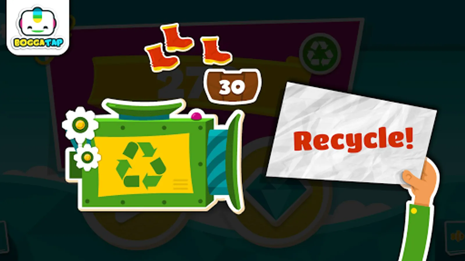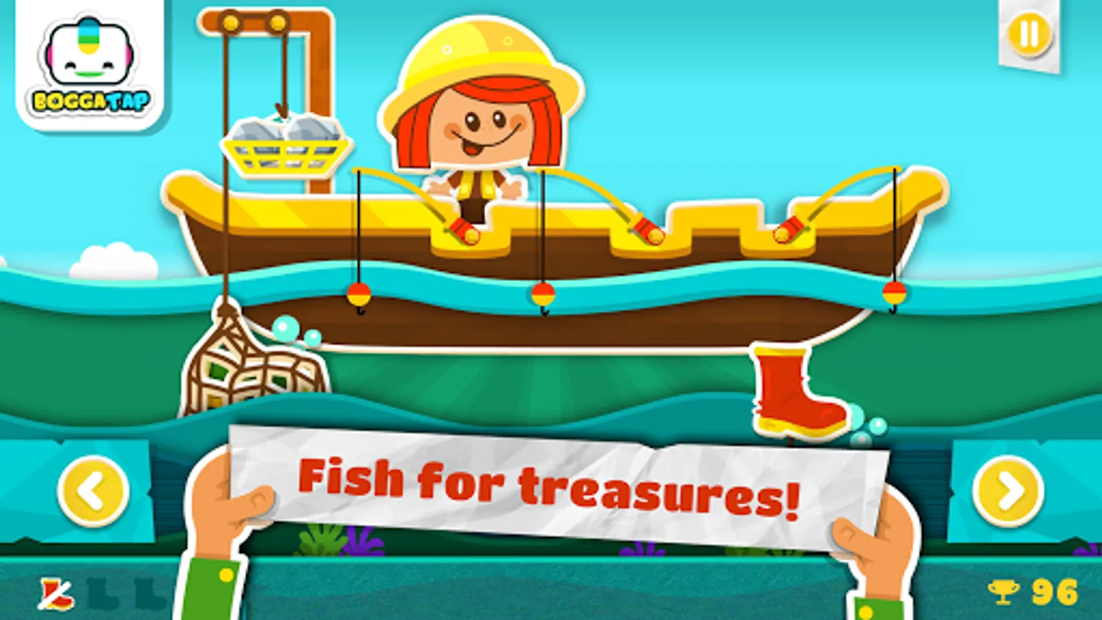 You can have both frantic fun and creative calm with Bogga Jewel! Juggle the three fishing poles and try to beat your own score, or just take your time, discover jewels and cute stickers, and use your skills as a treasure designer. How do you prefer to play? Don't forget to recycle the old boots that you pull out of the ocean!