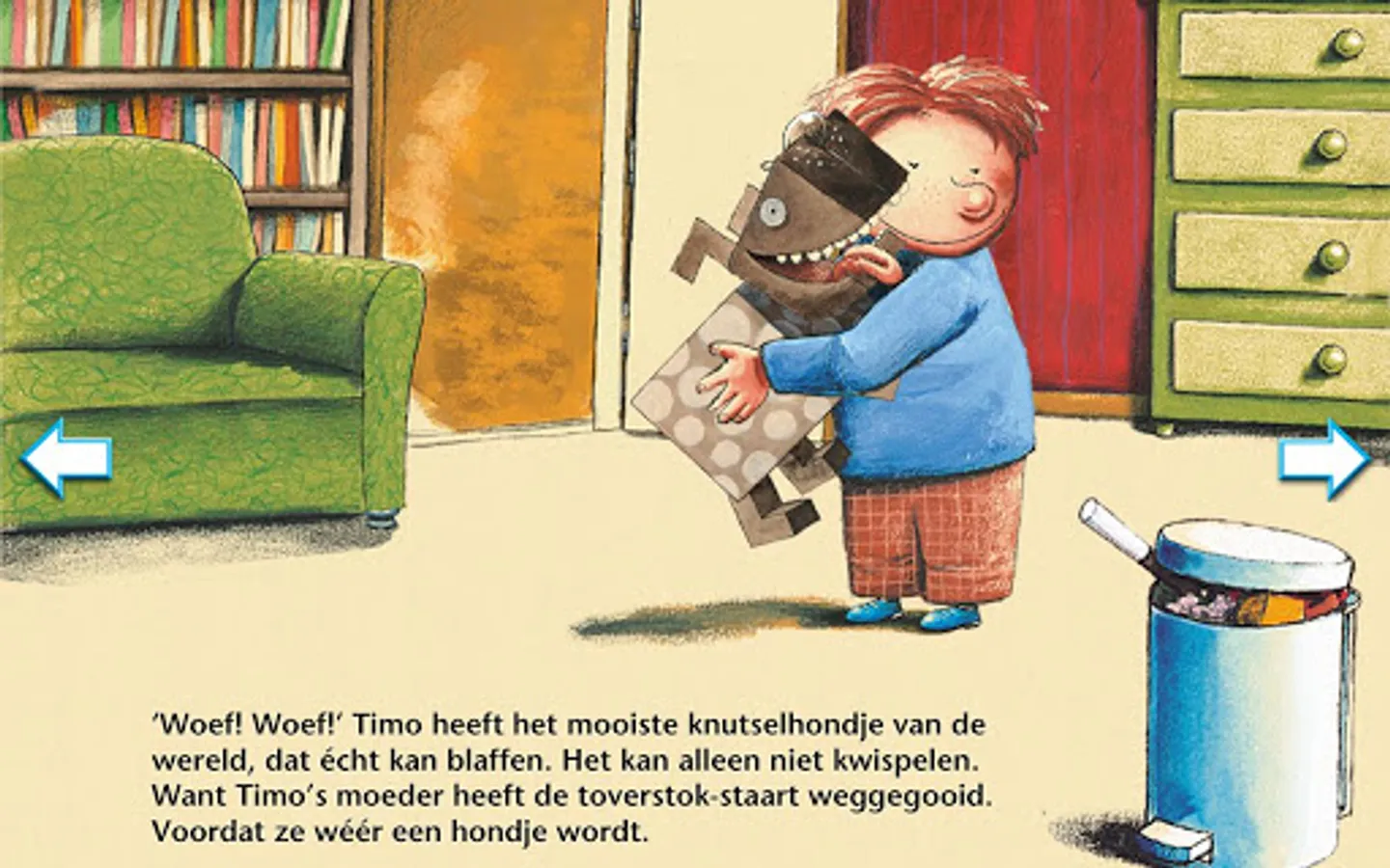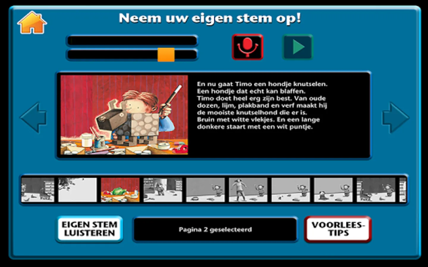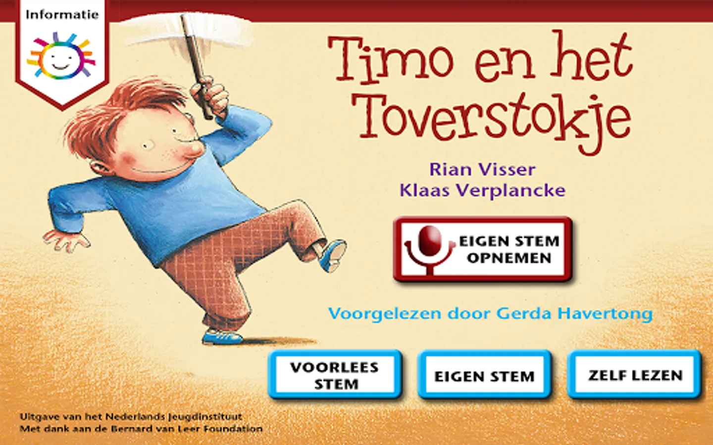 Timo and the wand is read by Gerda Havertong, but you can read it yourself and record your own voice. The app is offered for free by Dutch Youth Institute in cooperation with the Bernard van Leer Foundation.
