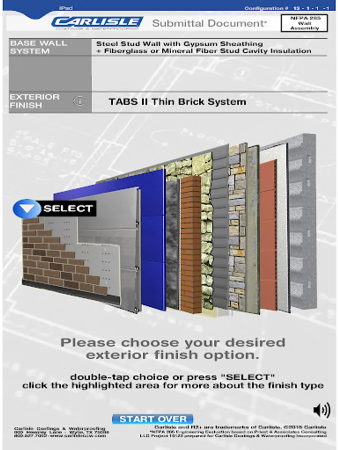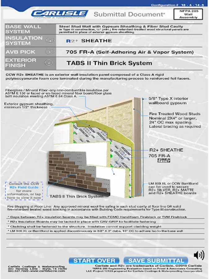 In addition, design professionals can specify all of the wall assemblies generated by this app which have been verified to pass NFPA 285, and a burn test often required by building code! This app can be now be used to assemble over 2,000 possible NFPA 285 tested wall assemblies incorporating CCW R2+ high-R, continuous insulation and CCW’s fully-adhered, high-performance air barrier membranes. The app provides quick, easy guidance for selection of CCW products and wall component options. Finally, the app allows the user to easily capture and share information by generating a print-out or digital image of the user-built wall assembly.