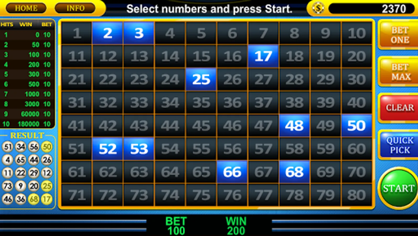 The player is given a ticket with 80 numbers on it. He picks 1 to 15 numbers on the ticket. 20 winning numbers are selected randomly. The more of the player's picks that are selected, the bigger the payout.