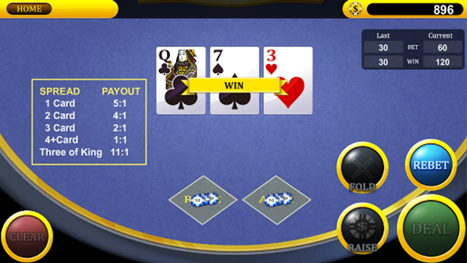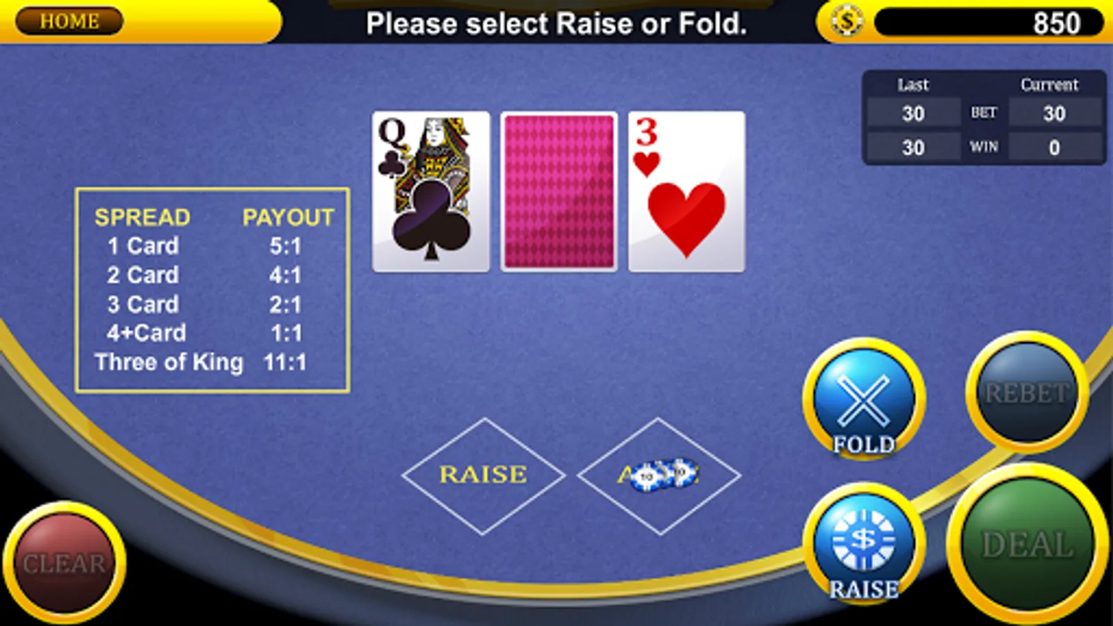 If neither of the above is the case (for example, a three and an eight), then a spread is announced which determines the payoff (a 4-card spread, in this example), and a third card will be dealt. Before dealing the third card, the player has the option to double his bet. If the third card's value falls between the first two, the player will receive a payoff according to the spread; otherwise the bet is lost.