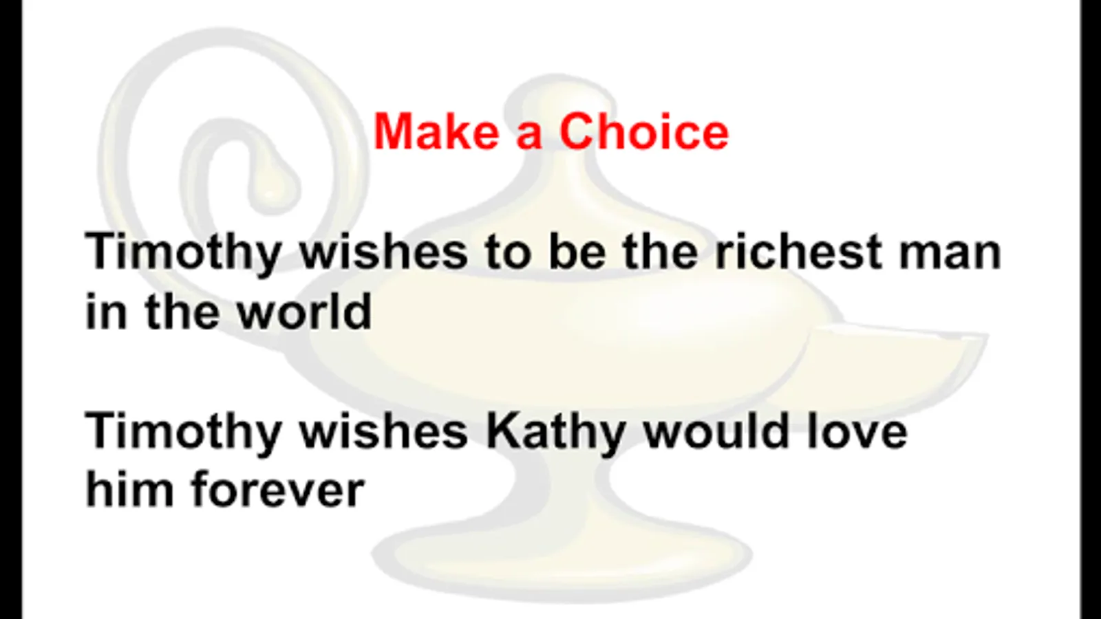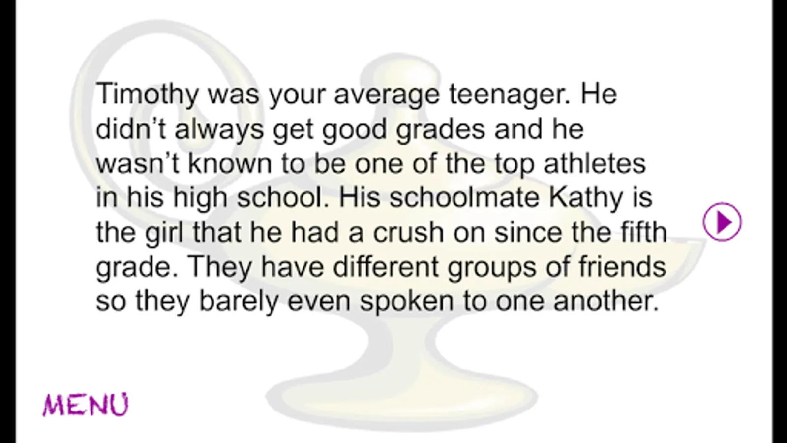 Three Wishes - Timothy is your typical teenager who had a crush on Kathy for the longest time. He likes her so much that he will go to great lengths to win her heart.