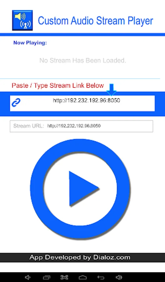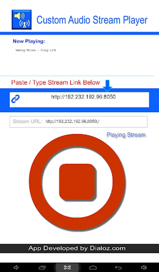 With our simple, easy to use Custom Audio Stream Player App You can Play any Audio Stream by pasting or typing ip or web address and then press play.