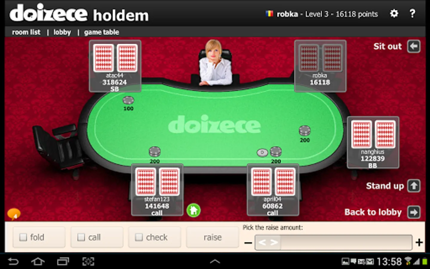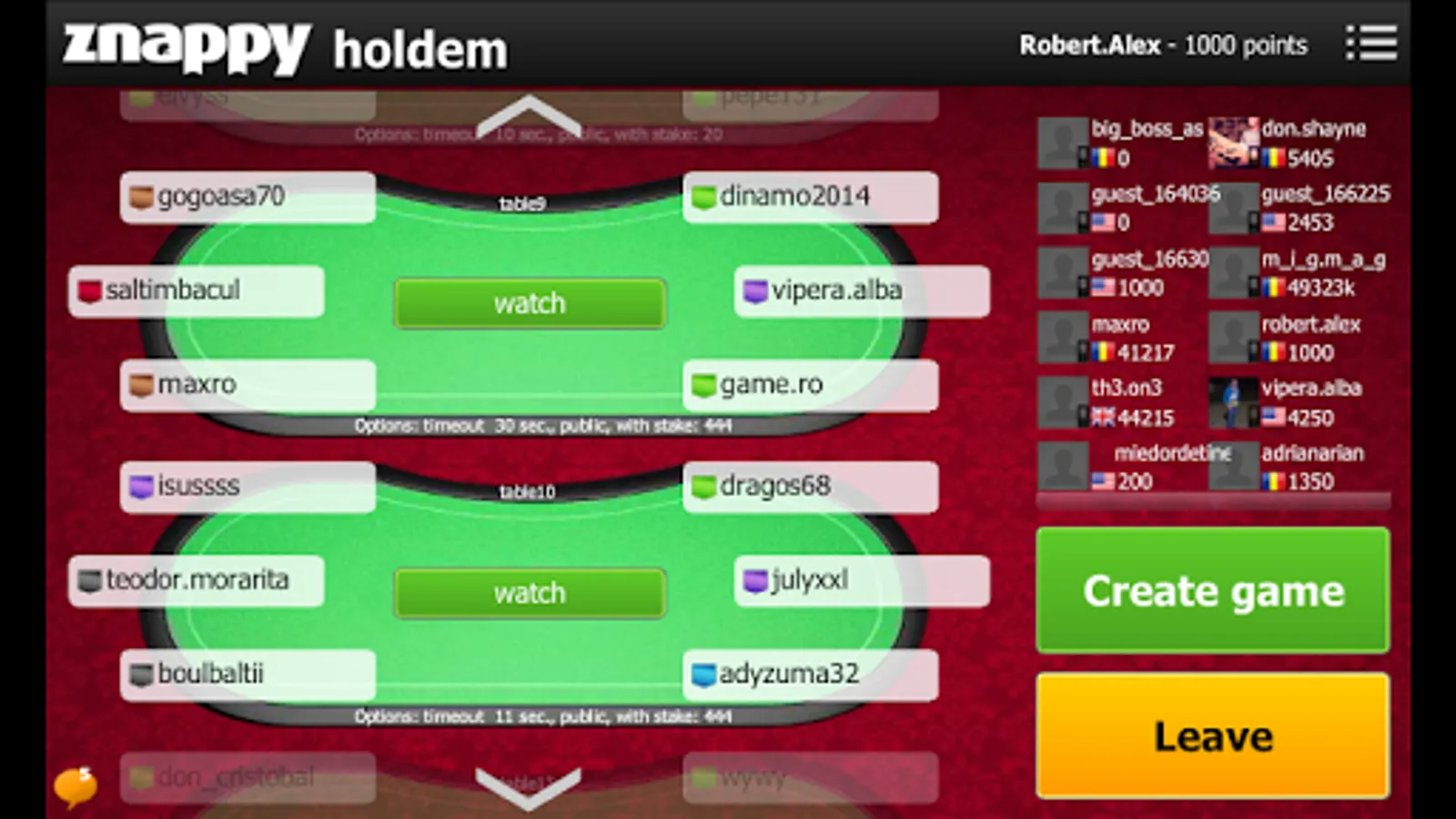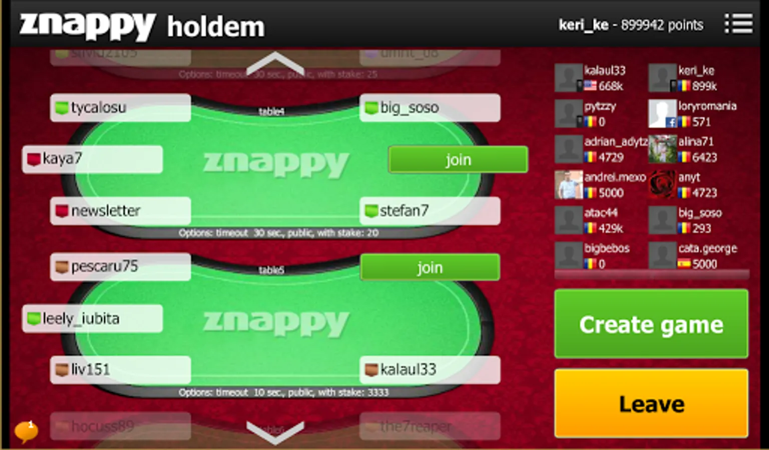 Znappy Holdem is the mobile application of http://holdem.doizece.ro/. Easy to access, fast and free: the player logs in with username and password or login with Facebook account. Entered in lobby, the player may choose to create a new table or join the existing ones.