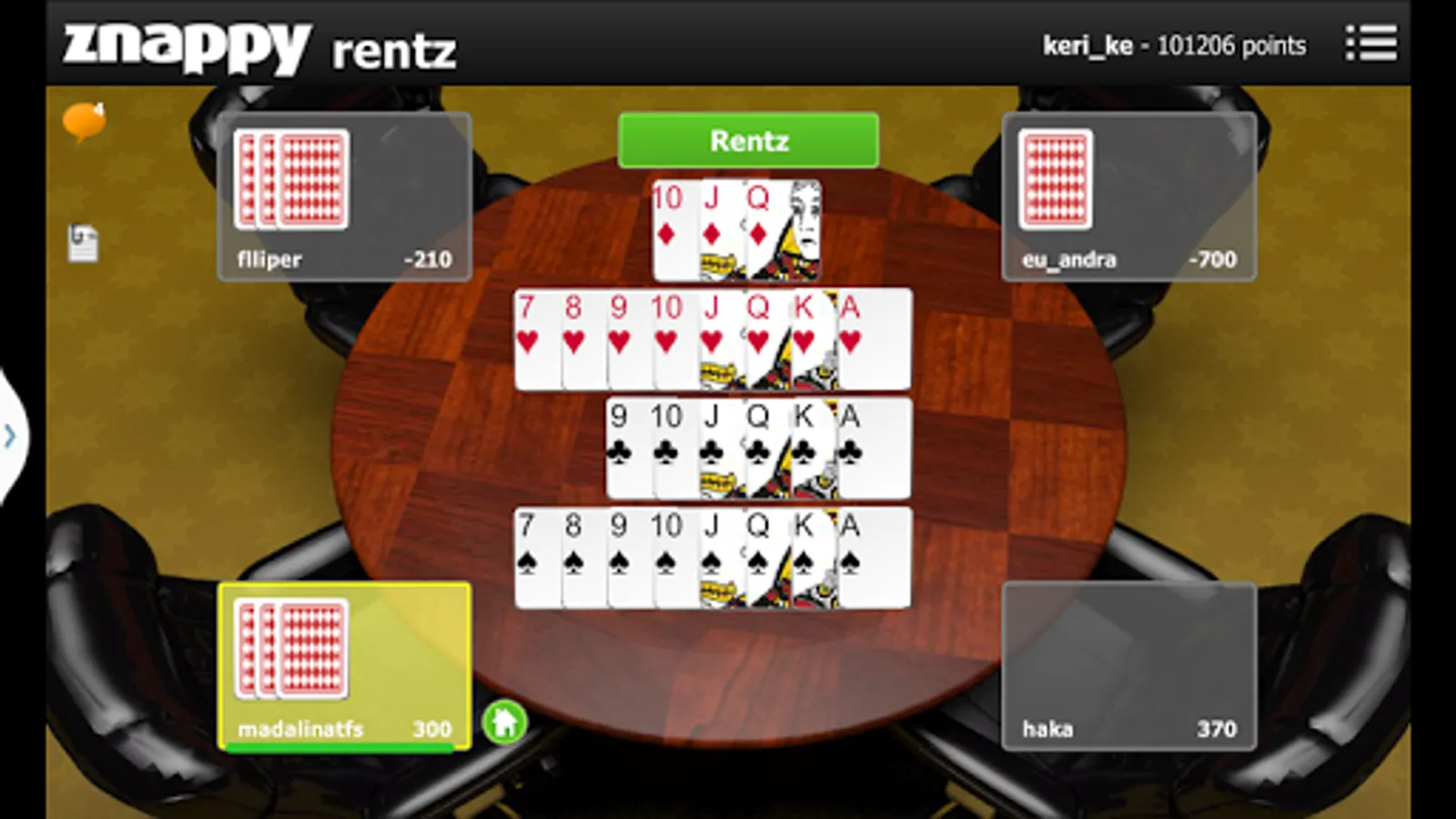 The only multiplayer Rentz Game, developed by http://www.znappy.com is now available free on Google Play. Known as King, Barbu or Bart, Rentz is played by 4 players, dealer being picked random at the start of each mini-game, with a 32 cards pack.