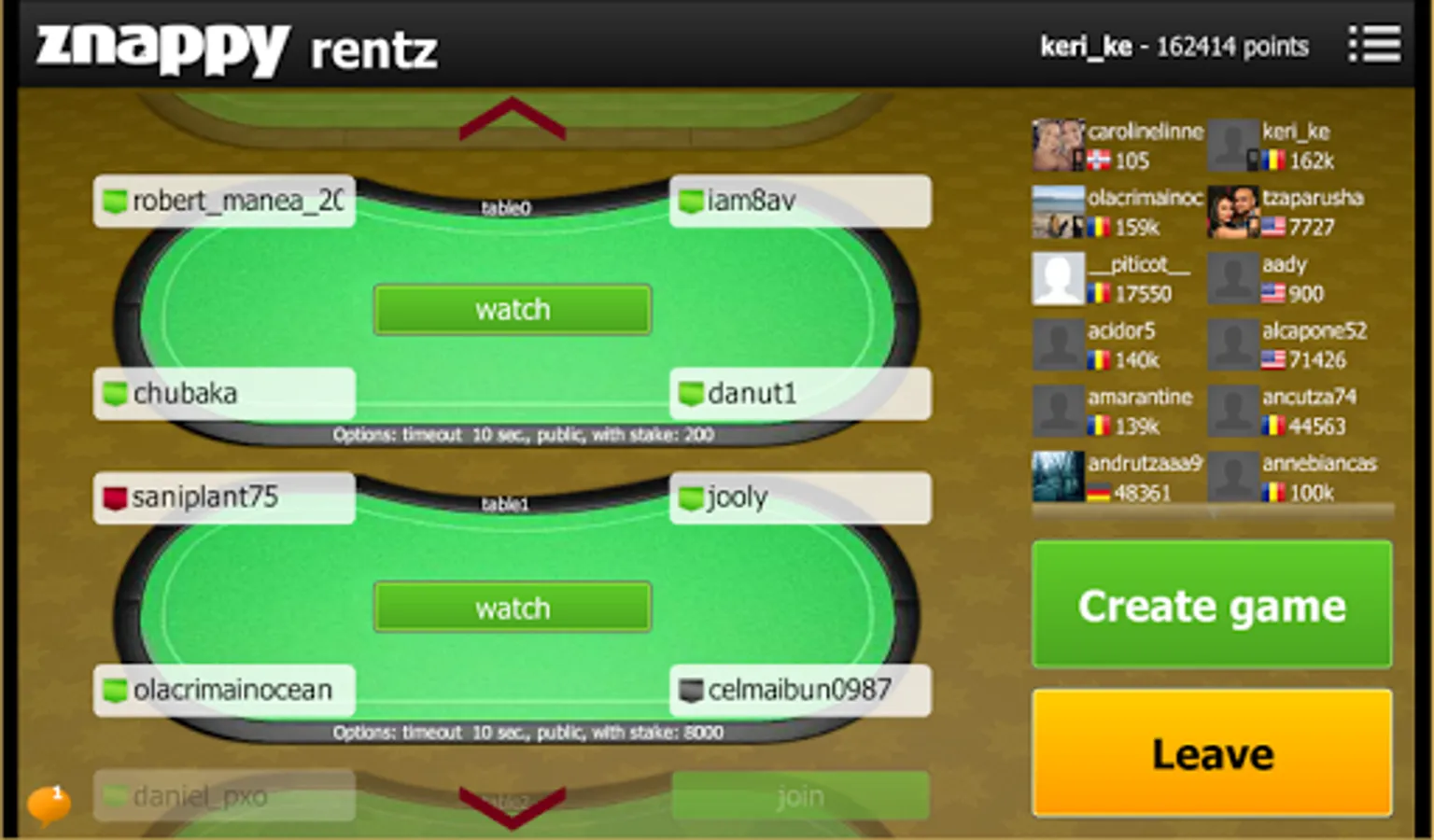 Easy to access, fast and free: the player logs in with username and password or login with Facebook account. Entered in lobby, the player may choose to create a new table or may join the existing ones.