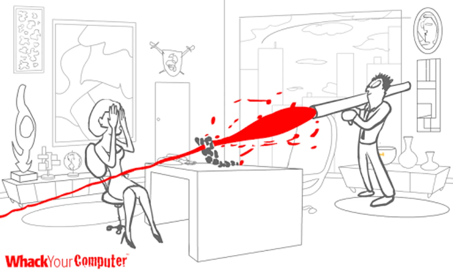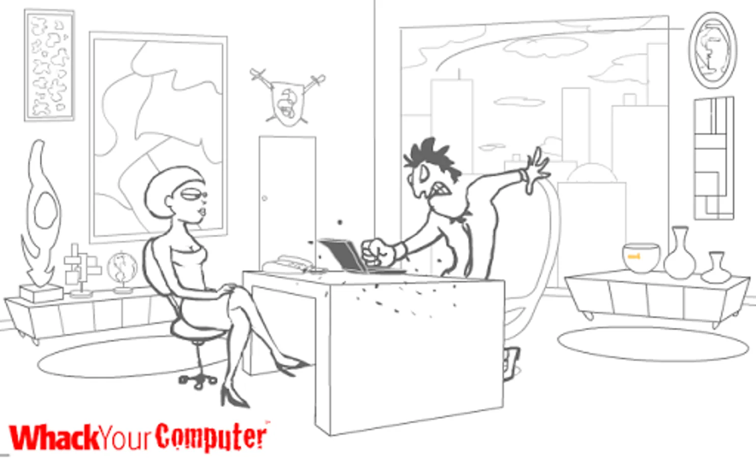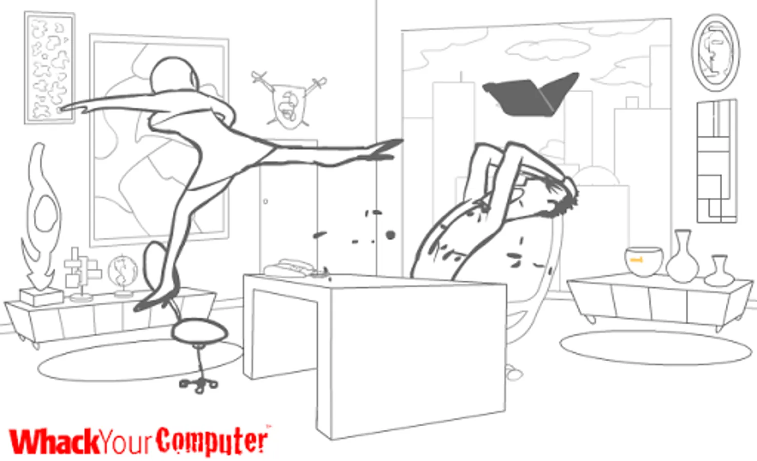 The crazy classic game now has more ways to whack your computer! 15 in total and all you gotta do is find them. The secretary has become a warrior-woman! She doesn't sit idly by while the boss whacks the computer she goes ballistic! Tap items in the office and take out all your aggression on the cartoon computer so that your actual computer will survive to serve you another day. As you find all the ways to whack the computer you will help our heroes return to their primal neanderthal state before there was a computer to whack. Another surprise: there's a new cleaner for the new three whackings!