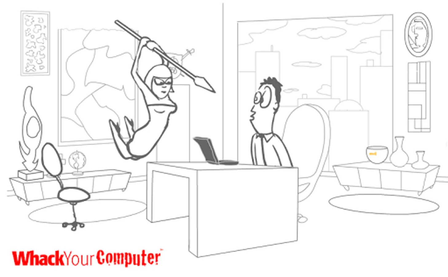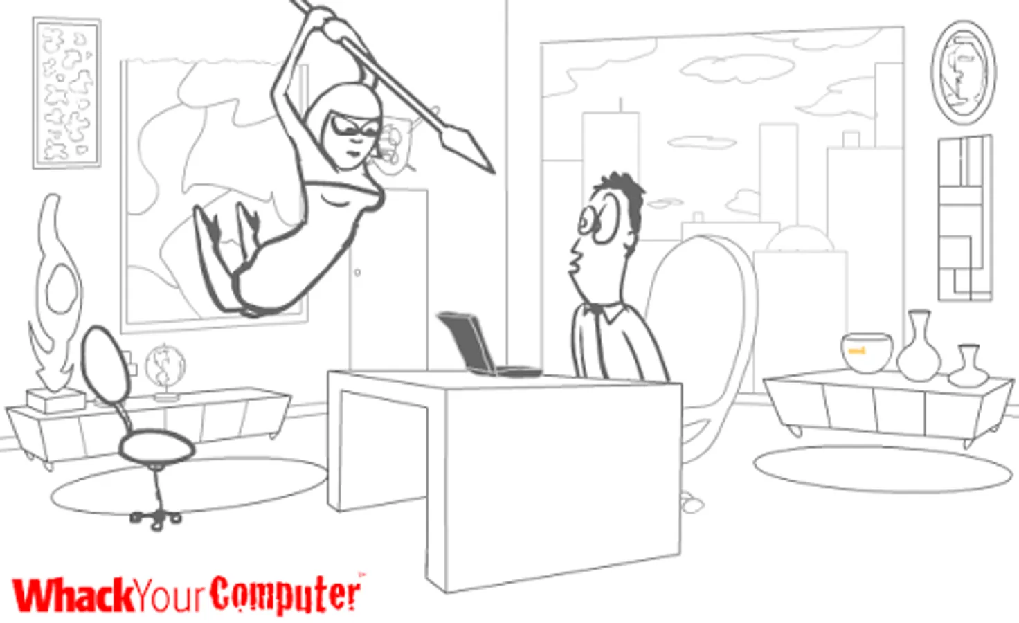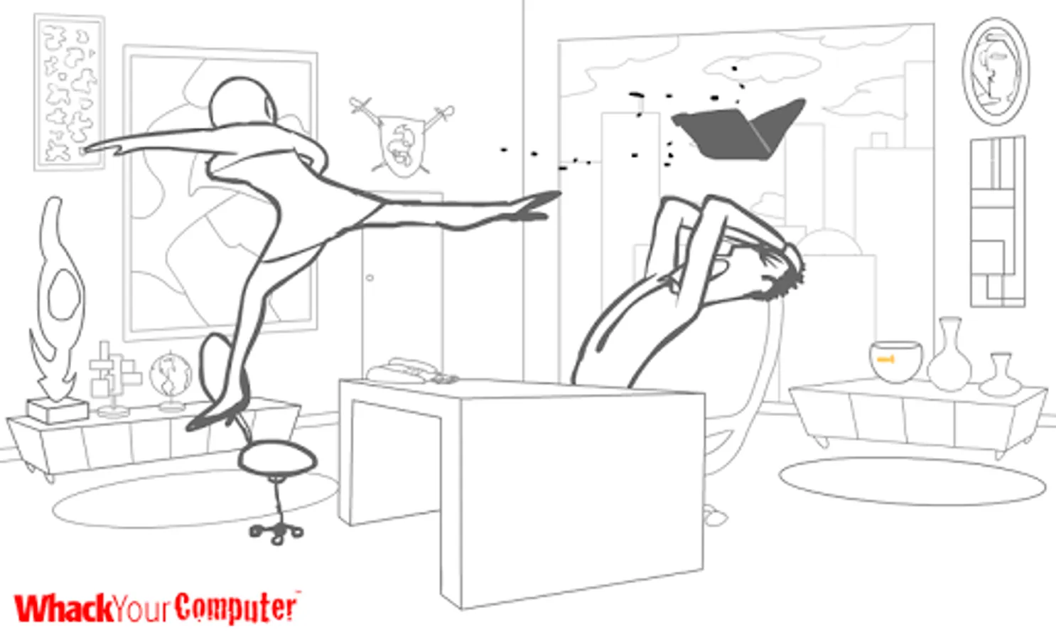 The crazy classic game now has more ways to whack your computer! 15 in total and all you gotta do is find them. The secretary has become a warrior-woman! She doesn't sit idly by while the boss whacks the computer she goes ballistic! Tap items in the office and take out all your aggression on the cartoon computer so that your actual computer will survive to serve you another day. As you find all the ways to whack the computer you will help our heroes return to their primal neanderthal state before there was a computer to whack. Another surprise: there's a new cleaner for the new three whackings!