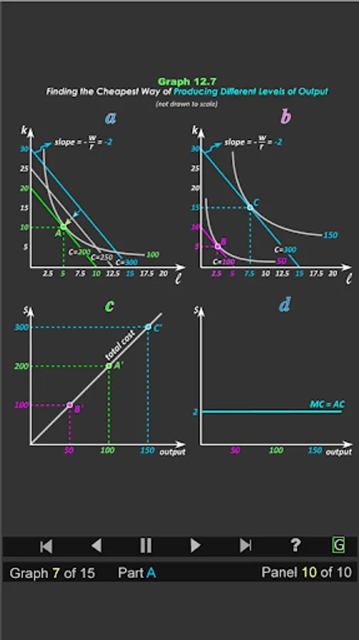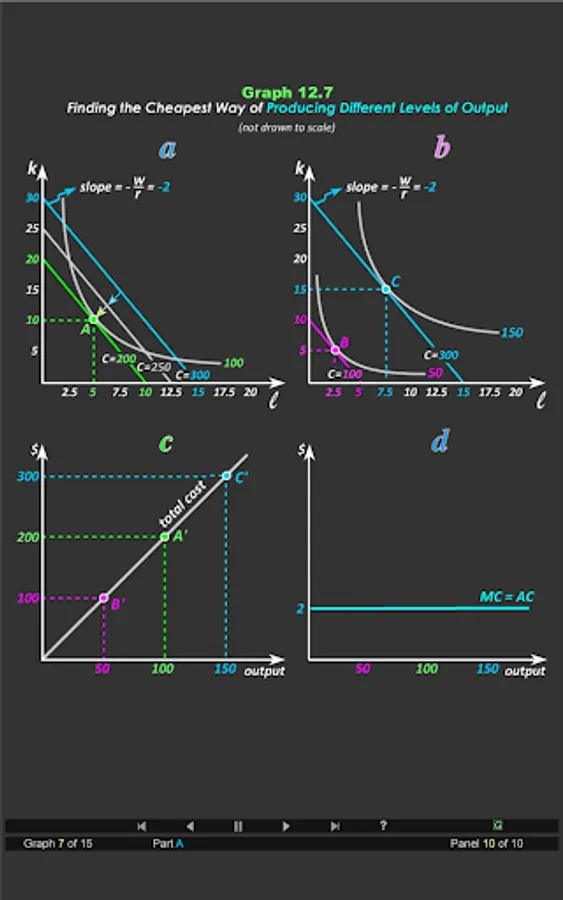 Animated and verbal exploration of topics began in Chapter 11 App are extended to multiple inputs. Cost curves and cost minimization are also considered. The importance of returns to scale is explored and how (if at all) it relates to the marginal product of individual inputs.