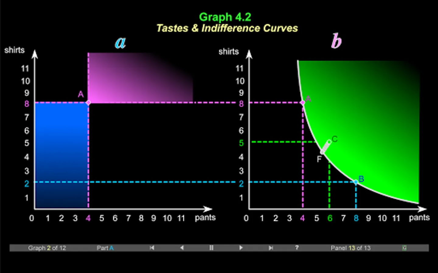 Preferences and Indifference Curves - animations and detailed audio explanations. Covers various standard assumptions about preferences, how these assumptions translate into indifference curves. In part B, 3 dimensional utility functions are used to motivate an intuitive connection between utility and the normal 2 dimensional drawings used in Intermediate Micro.