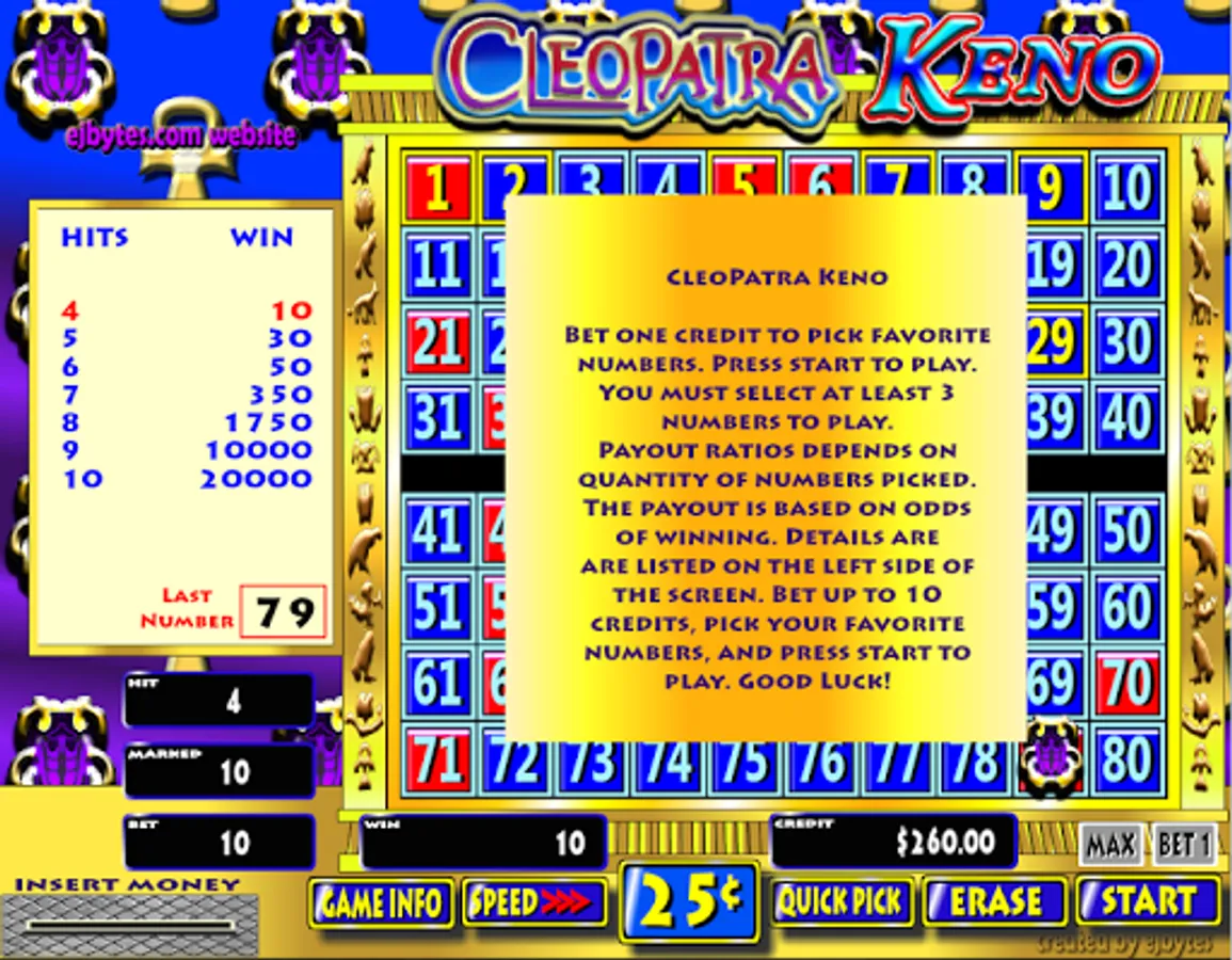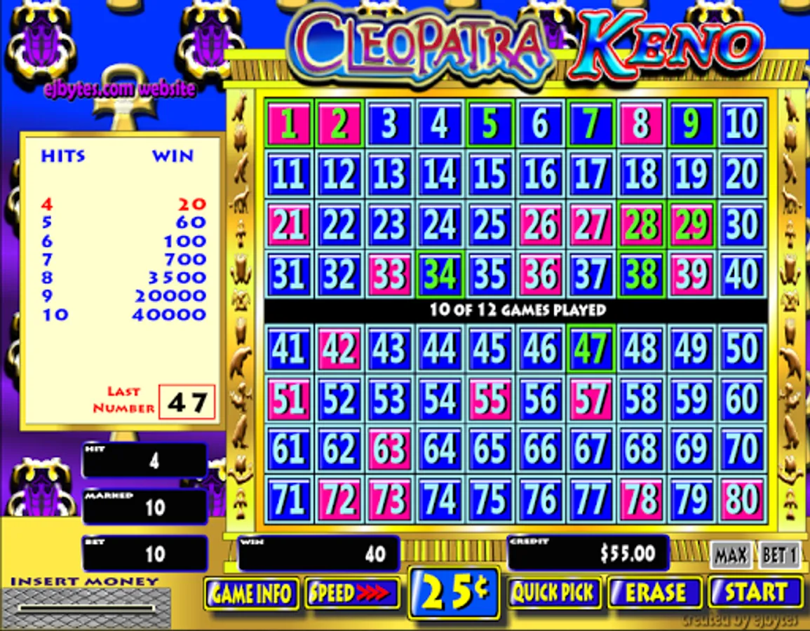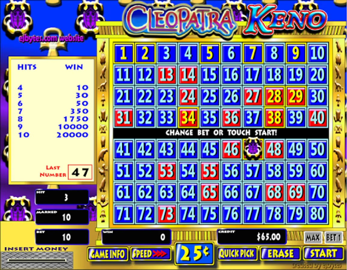 A beautiful version of Keno. The game is laid out just like the game at the casino. There are 12 Bonus Rounds with double wins. Click on the Money Slot to insert virtual money. Select betting type, $0.05, $0.25, and $1.00 per credit. Select your favorite numbers (3-10) by pressing the numbers. Press START.