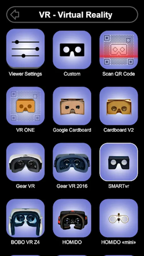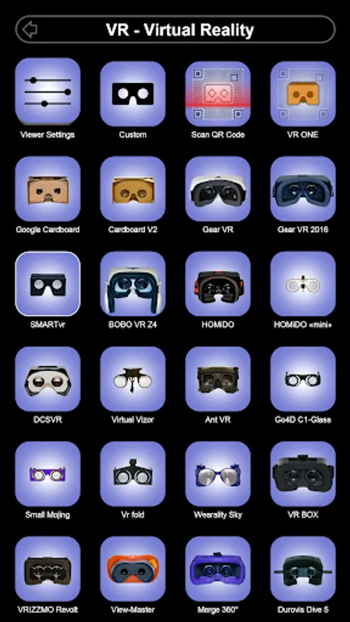 Even if you don't have a QR code, you can setup your viewer by using one of the many viewer presets. Viewer presets are available for these viewers: Google Cardboard & Daydream View (version 1 and 2), Gear VR, VRIZZMO Revolt, DCSVR (I Am Cardboard), Homido (mini), Ant VR, Go4D C1-Glass, Small Mojing, VR fold, Wearality Sky, Durovis Dive 5, VR BOX, Baofeng Storm II, ColorCross VR, Nibiru/Soyan/..., Geeach and Ritech 3D.