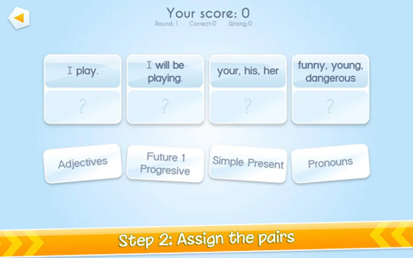 This entertaining and educational matching game app helps you practice your English grammar and spelling in a fun way. Whether you need to brush up on parts of speech, conjugation or declination, tenses and types of sentences - no matter what you need, the various grammatical areas can be combined with each other and practiced. With one click, the appropriate themes are chosen, easy as pie, and you can start right away. Matching pairs must be found, either by purely assigning terms to the proper categories (funny = Adjectives | I would like to play = Futur 1) or as a concentration-enhancing matching game.