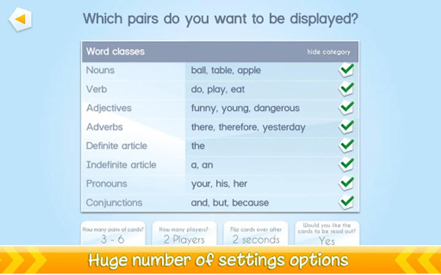 Both the number of card pairs and the number of players are, of course, variable. Depending on your wishes, the cards can be read aloud, and the length of time in which the cards are revealed is adjustable. The difficulty level of the app increases with the number of card pairs and the chosen area of grammar. It is aimed at all students who are not yet entirely comfortable in their use of grammatical terms or who want to practice for their next grammar lesson in a fun way. You can also work on improving your spelling.