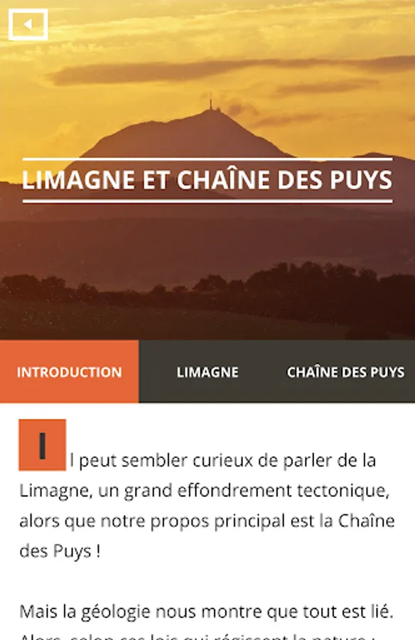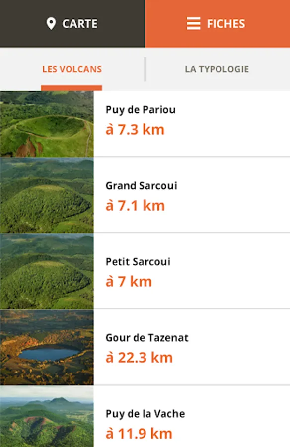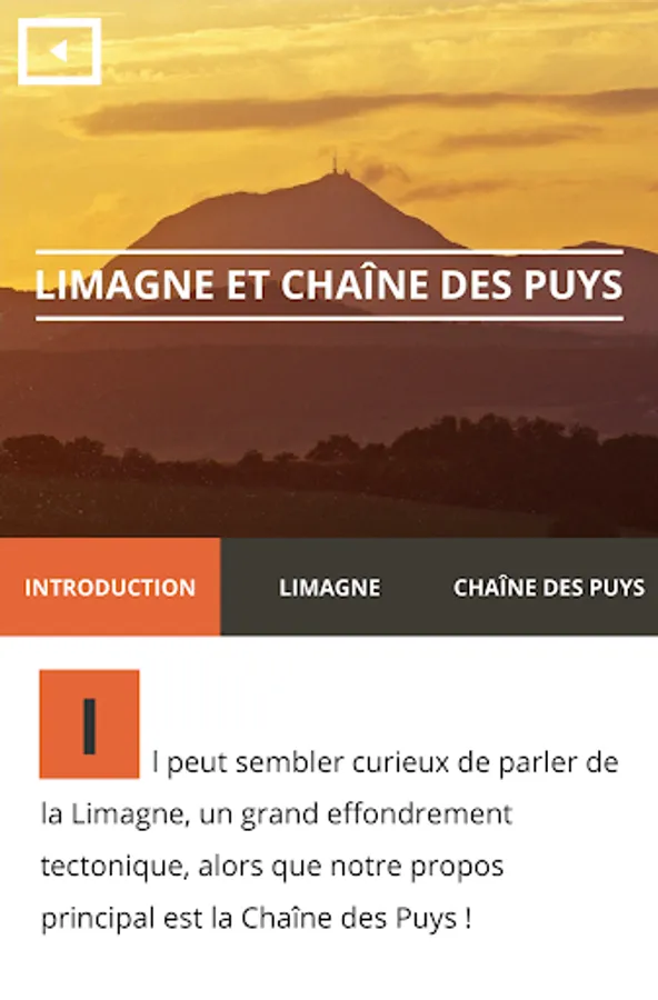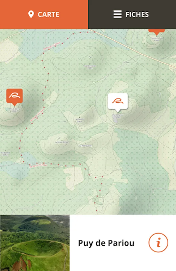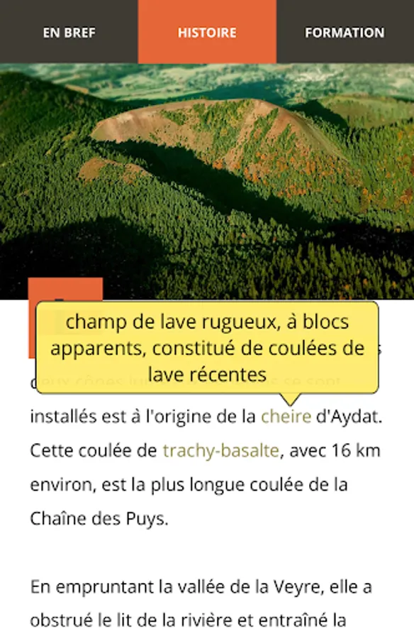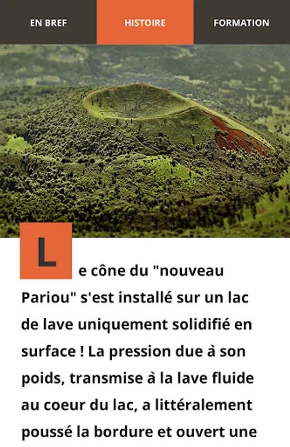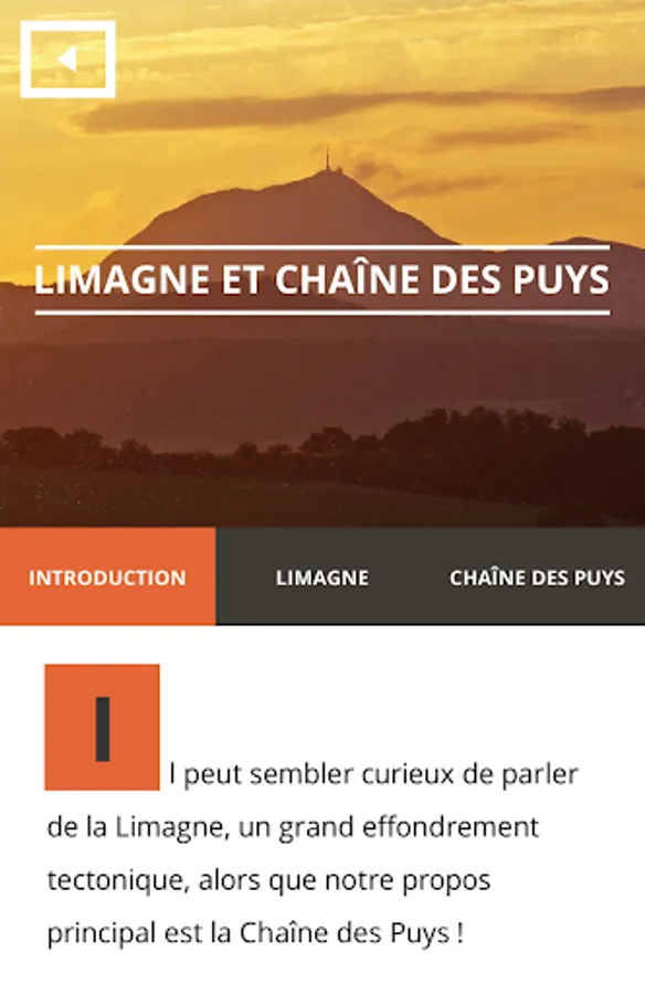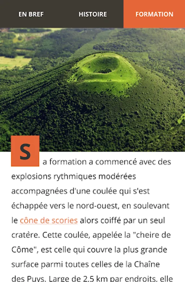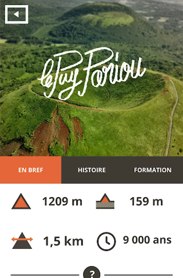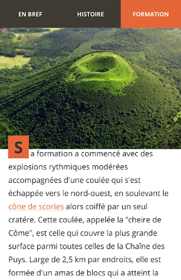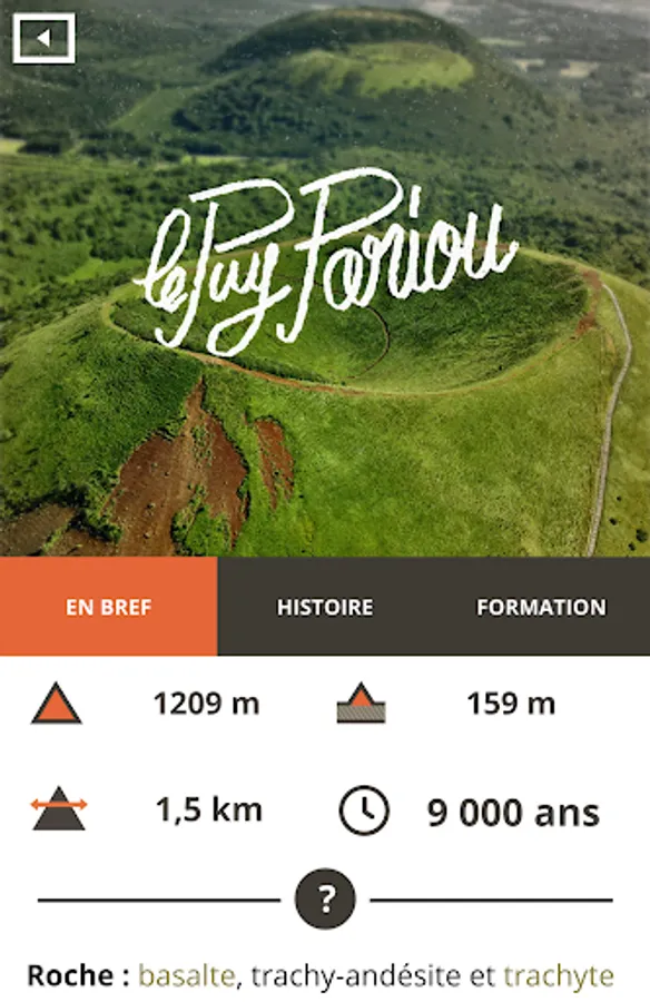 The app contains identification sheets of 18 volcanoes in the Chaîne des Puys, written by an expert volcanologist.