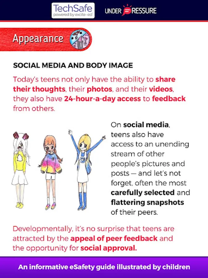 Packed with resources, advice and practical tips on cyberbullying, appearance and stranger contact, TechSafe Under Pressure will raise your awareness to help you understand and deal with the pressures kids and teens say they currently worry about online.