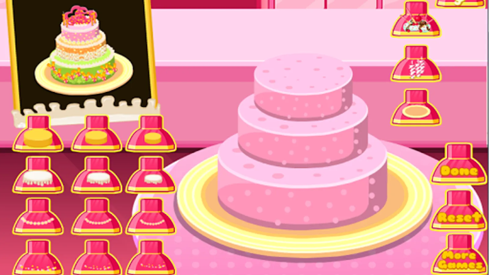 In this game you have to prepare a cake for your friend's birthday. We are not so good in making cakes, so we need you. The cake will have three floors and each floor and cream you will have to choose or what bakery items to put on it. First, you must choose the cake base. You can choose a countertop made of chocolate, vanilla, strawberry, cherry, kiwi and banana. After you choose the cake dough, you must choose the preferred model on which we put on the cake, polka dots, twigs, ice crystal, crown or necklace of hearts. After choosing the model you have to choose and cream to put on this wonderful cake. You can choose between different creams, vanilla, strawberry, cherry or orange. Still you need to put them and some balls of whipped cream: strawberry with whipped cream, dark chocolate, vanilla, strawberry white chocolate raspberries or cherries. Now you have finished the cake base and you must make the second floor.
