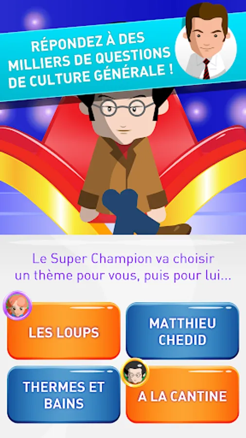 Everybody Wants To Take His Place Mobile incorporates the principles of the TV program broadcast on France 2 by allowing players to challenge champions through issues "DUO", "SQUARE" or "CASH". General culture and how quickly the answers are the keys to success in this game!