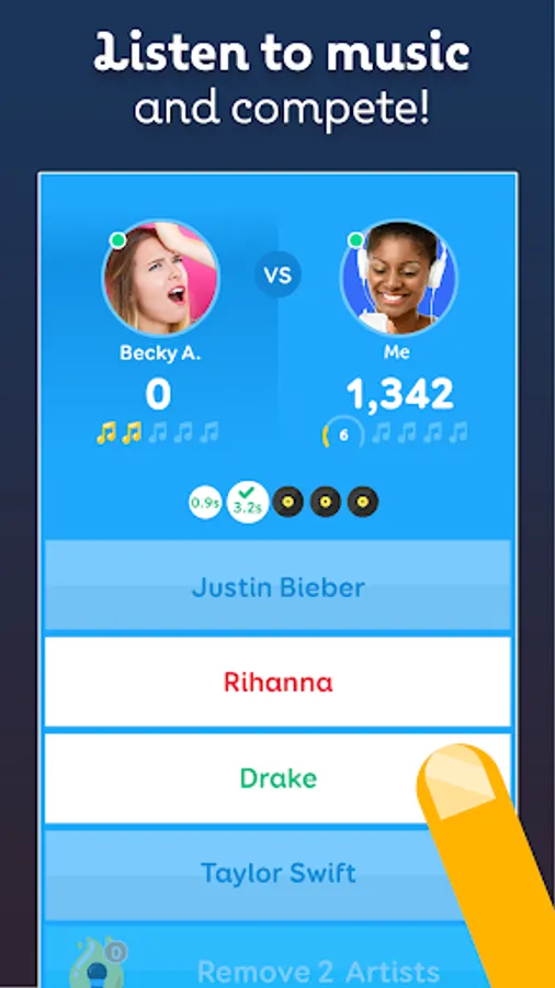 Listen to more than 100,000 real music clips from artists such as the award-winning Billie Eilish, the renowned Ariana Grande, Justin Bieber, Cardi B, classic tunes from Queen, and more. Guess the correct artist and song title faster than everyone else to win.