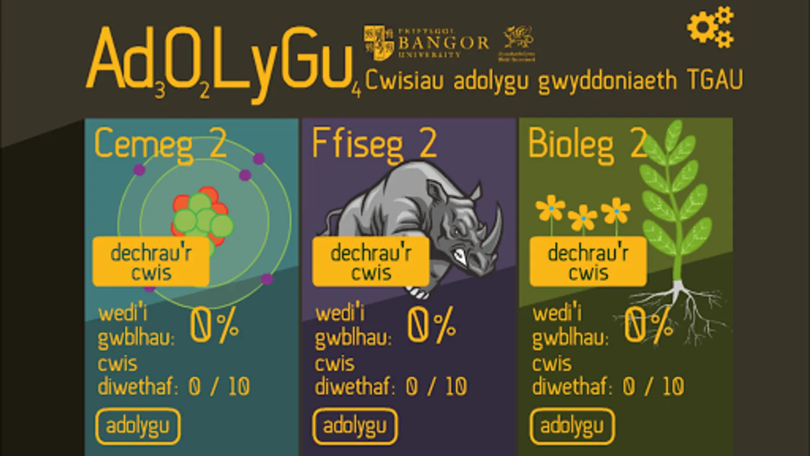 Wedi’i seilio ar Ganllawiau Adolygu Gwyddoniaeth TGAU Prifysgol Bangor, mae’r ap gwych hwn, sy’n rhad ac am ddim ac yn gwbl ddwyieithog, yn cynnig cwisiau i dy helpu wrth baratoi ar gyfer arholiadau gwyddoniaeth TGAU.