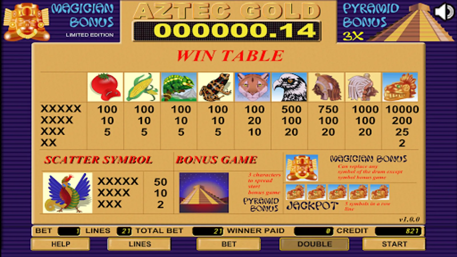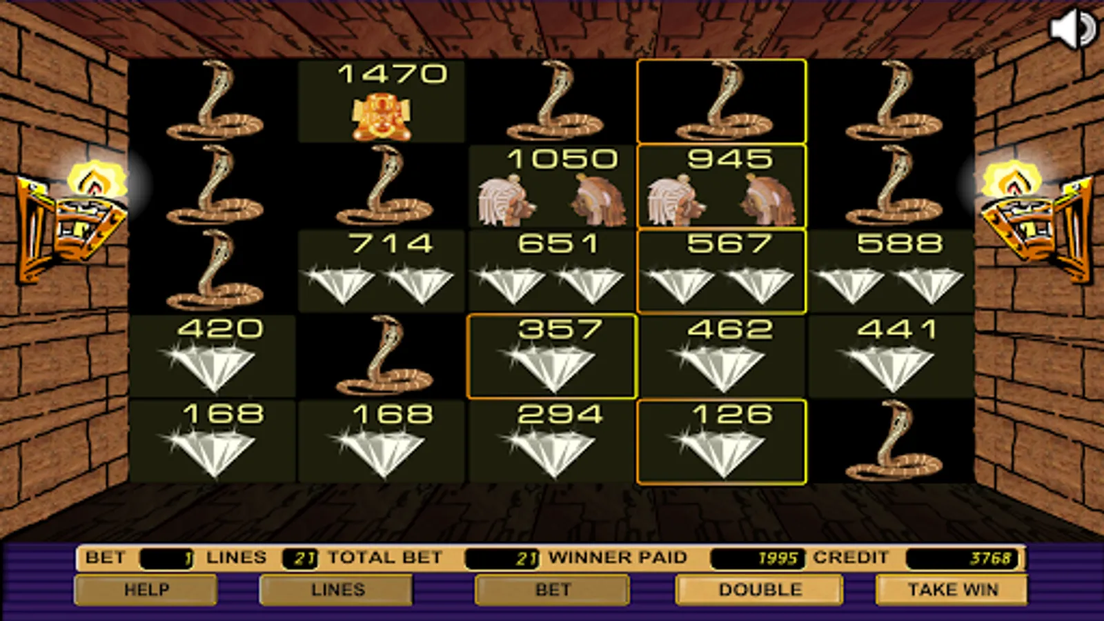 A colorful slot machine will tell gamblers the story of the gold of Aztecs, majestic pyramids and secrets that no one could unlock. The structure of 5 reels and 21 lines is standard for this game. Players also have an ability to activate either only one line or all 21.