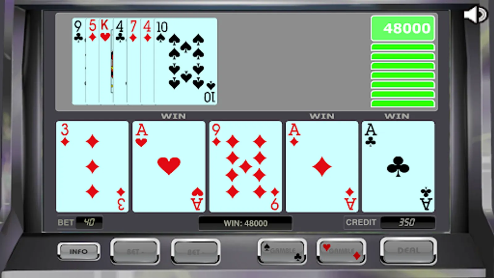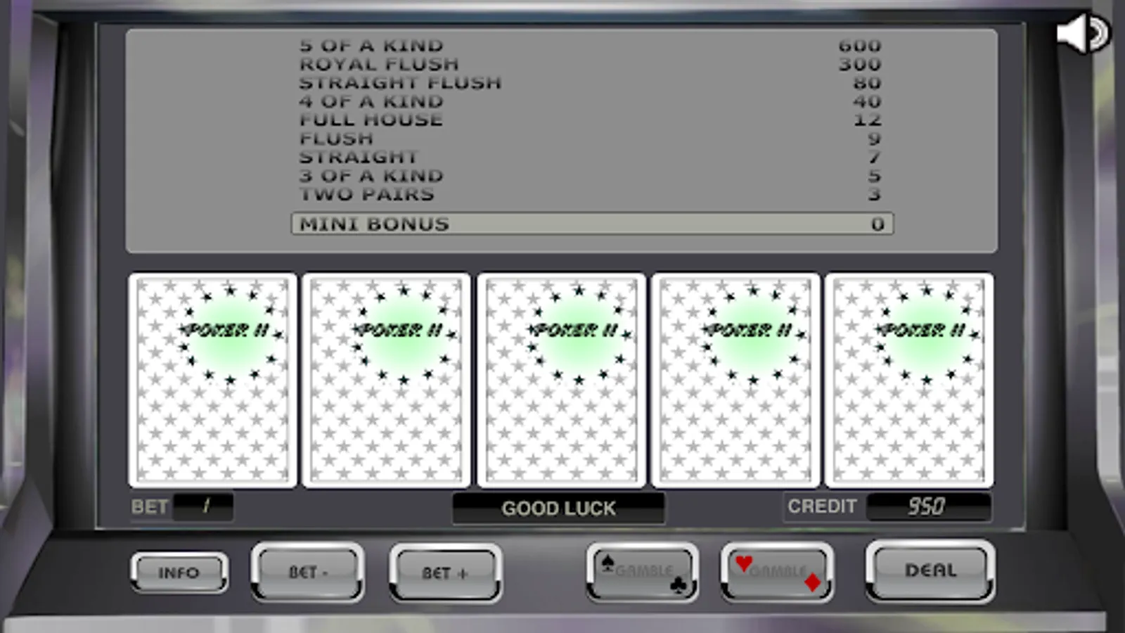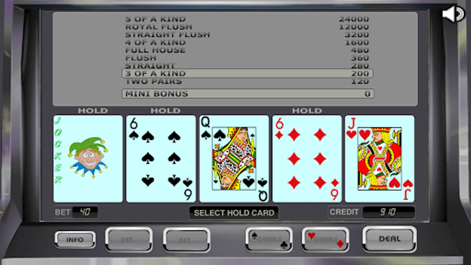 American video poker with a deck of 52 cards and a joker, two rounds, each paid with one bet, automatically save the second hand of cards for a possible winning combination, the bonus "Mini Bonus" with accumulation: It accumulates in and wins after several successive gains of"high pair / two"J"and more /. Bet-up to 100 credits, maximum profit in the main game is 300 times your bet, duplicate game