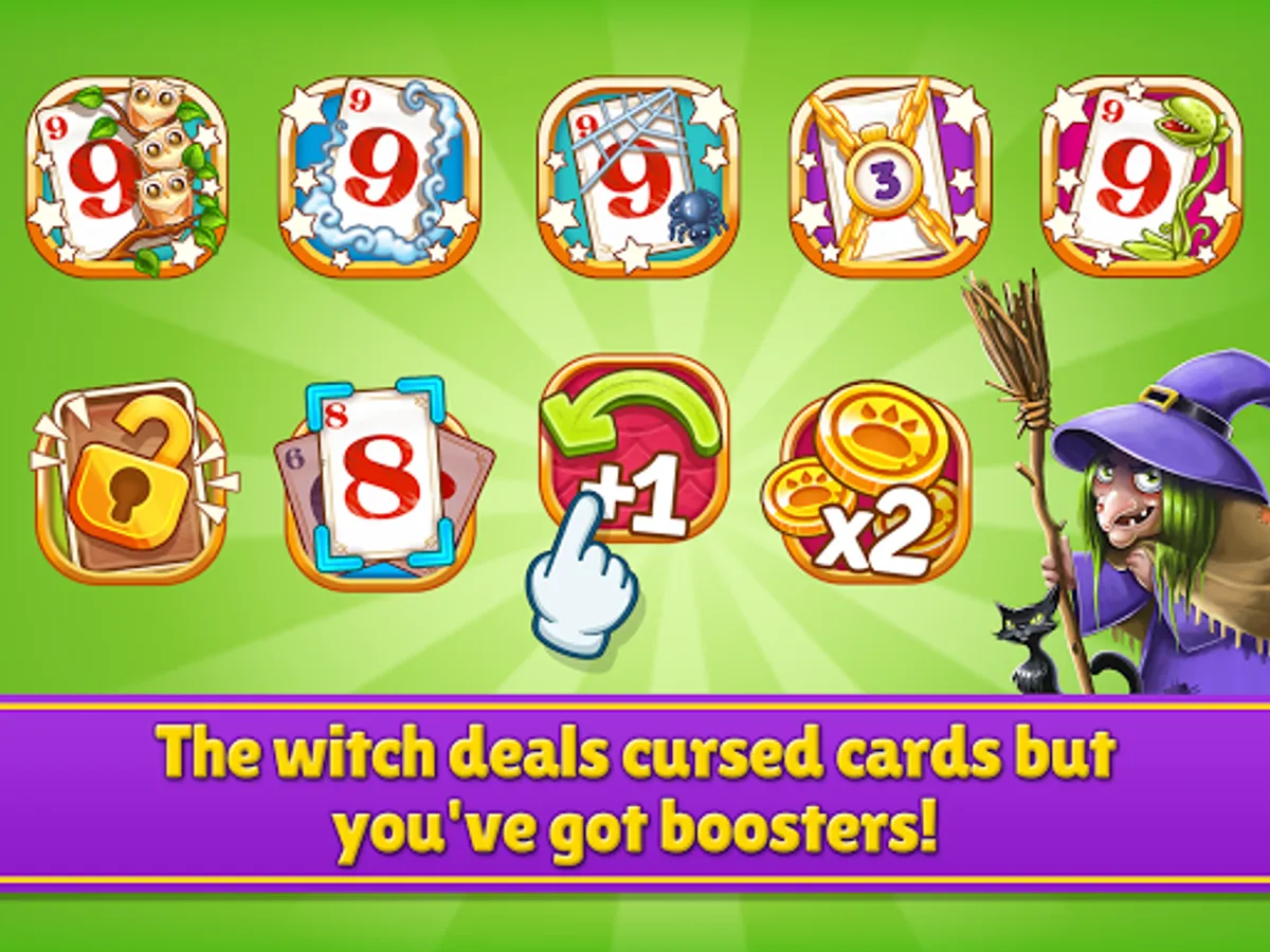 The evil witch is challenging you to play the most addictive card puzzle. She has a cursed deck with many trick cards, illusions and mystery!