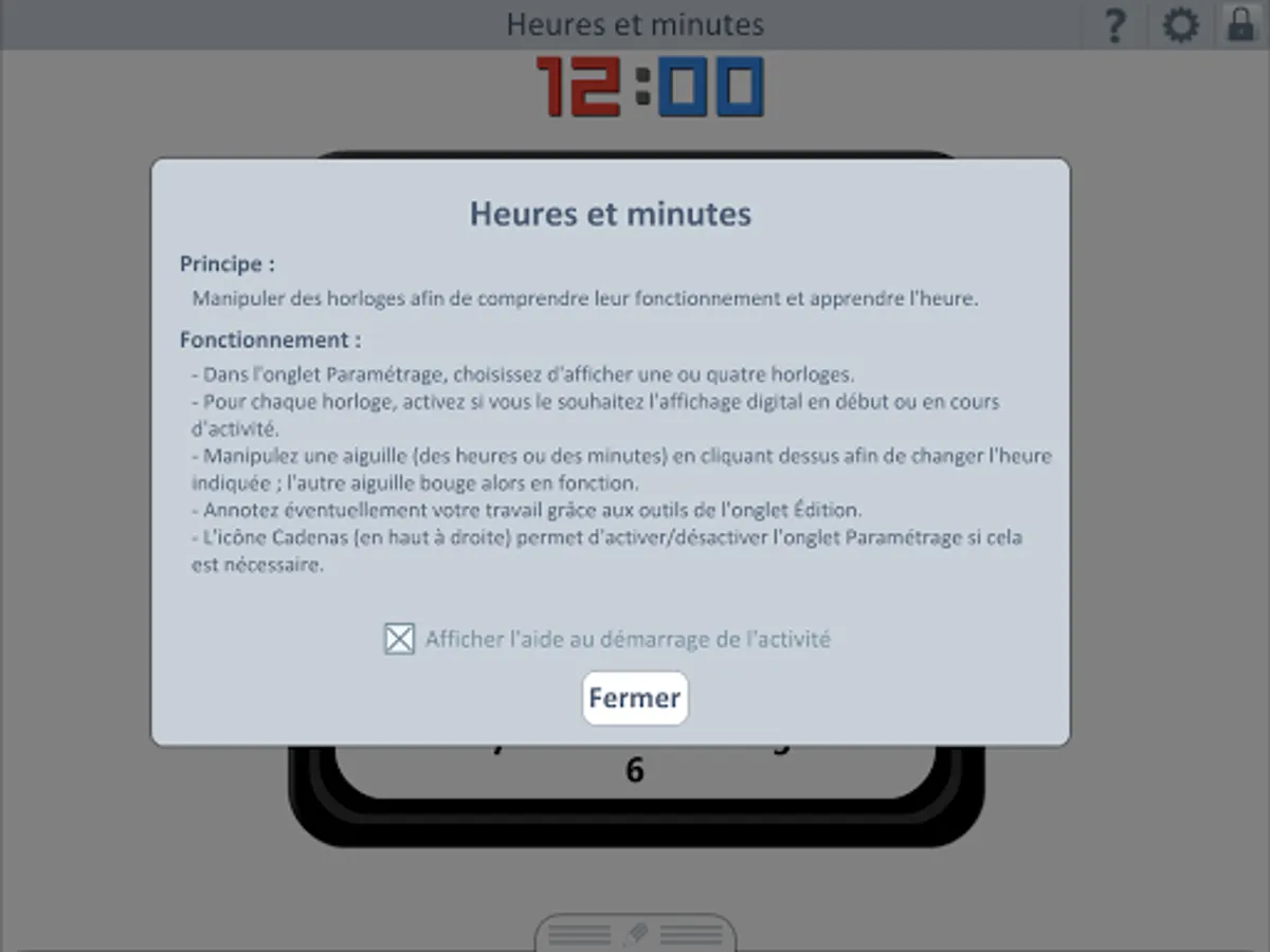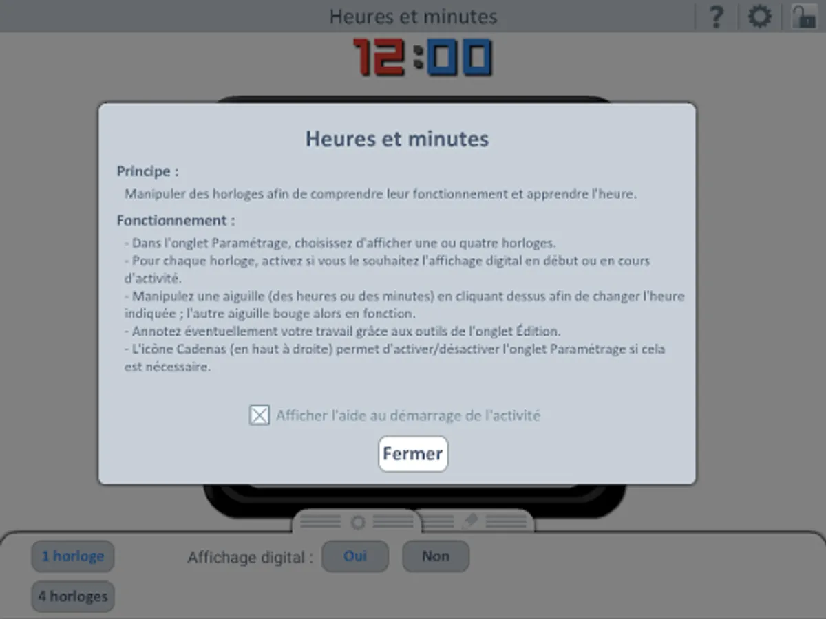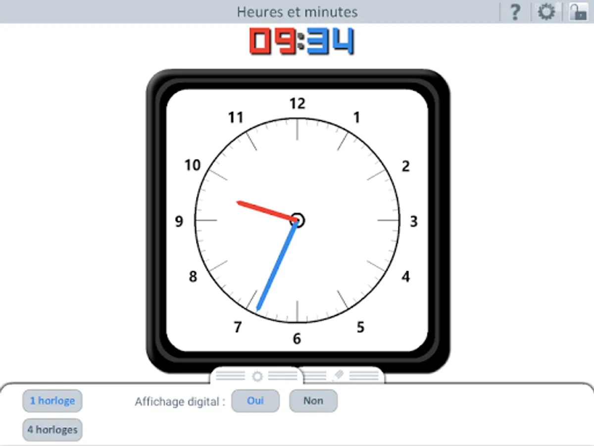 This application displays one or four analog clocks (with possibility of digital display) to work on playing time.