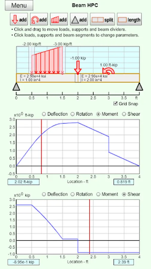 Beam HPC app calculates the moment, shear, deflection and rotation diagrams for a beam with various types of loading. Loading types include forces, moments and distributed loads. The load location and magnitude can be changed at any time. There are three types of supports (i.e. boundary conditions) including pinned, fixed and vertical roller. Each beam can be split into sub-beam segments. Each beam segment can have a different moment of inertia (I) and stiffness (E). The user can click and drag all items to quickly change and compare results. This program is designed for educational uses only. It should not be used for commercial purposes. There is no warranty or guarantee the results are accurate, and the user accepts all responsibility for values calculated.