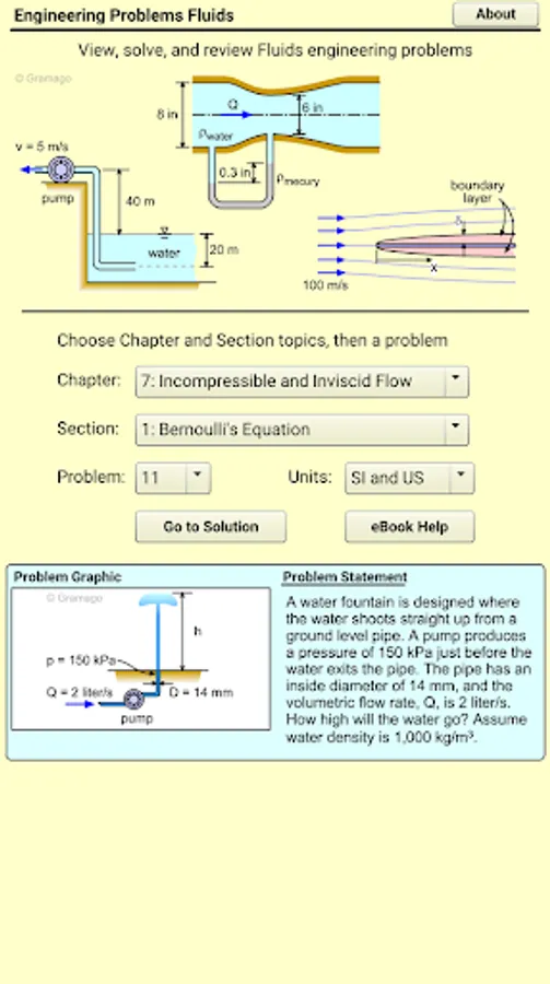 Eng Fluids app provides over 250 real homework and test problems for the common engineering course called Fluid Dynamics. All problems are organized in sections and chapters common to most textbooks. Each problem has a complete solution with graphics to help you better understand how to solve the problem. Also, each problem has a link to a theory web page for that section at the online eBook (eCourses.ou.edu or eCoursesBook.com). There is no cost for the online eBook, and it can be accessed outside of the app.