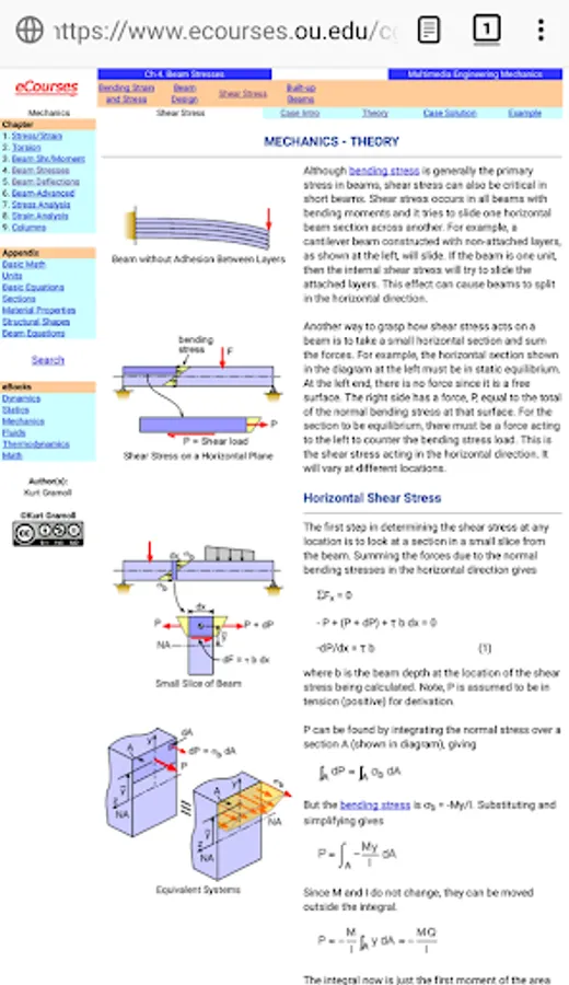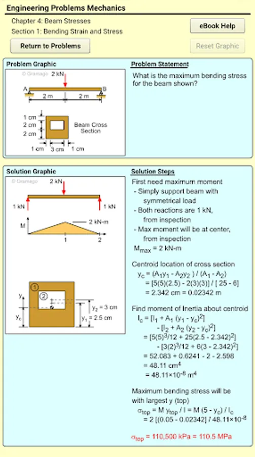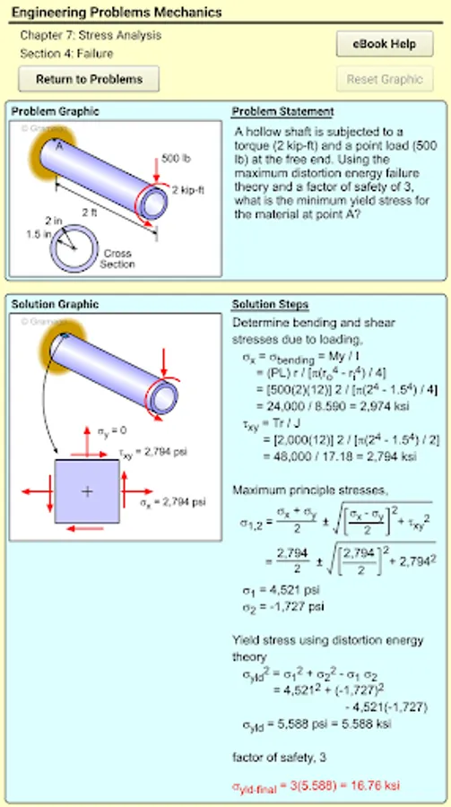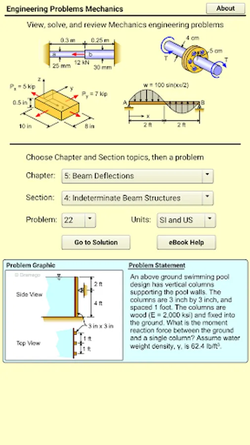 Eng Mechanics app provides over 400 real real homework and test problems for the common engineering course called Mechanics of Materials, Deformable Bodies, or just Mechanics. All problems are organized in sections and chapters common to most textbooks. Each problem has a complete solution with graphics to help you better understand how to solve the problem. Also, each problem has a link to a theory web page for that section at the online eBook (eCourses.ou.edu or eCoursesBook.com). There is no cost for the online eBook, and it can be accessed outside of the app.