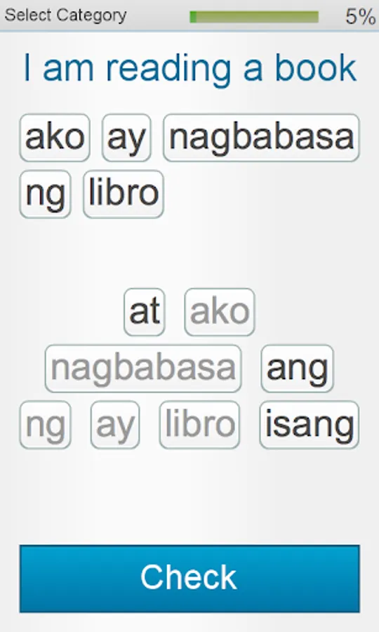 Learn Tagalog by recognizing words and images, finding the missing word, completing sentences and building sentences.