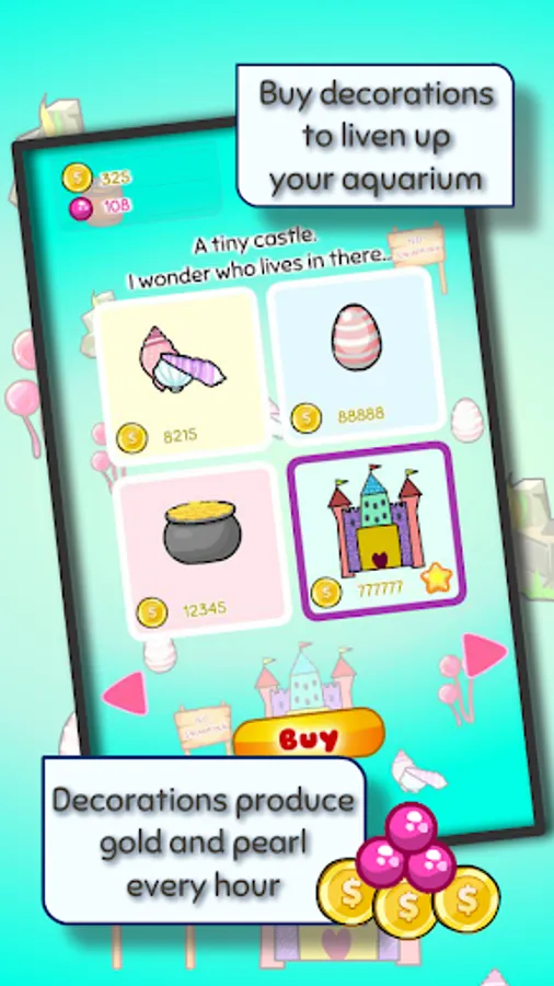 Play a simple game to earn coins and use them to purchase fish and artifacts to decorate your aquarium.