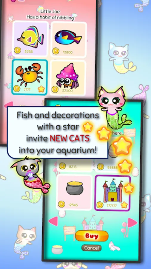 Special fish and artifacts attract unique cat-mermaids into your aquarium!
