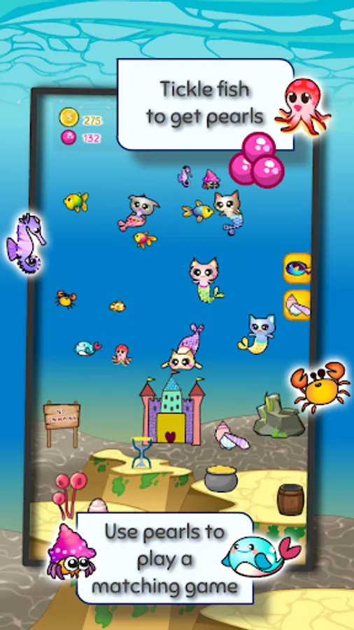 Pet fish to obtain items and let your cat-mermaids collect them for you.