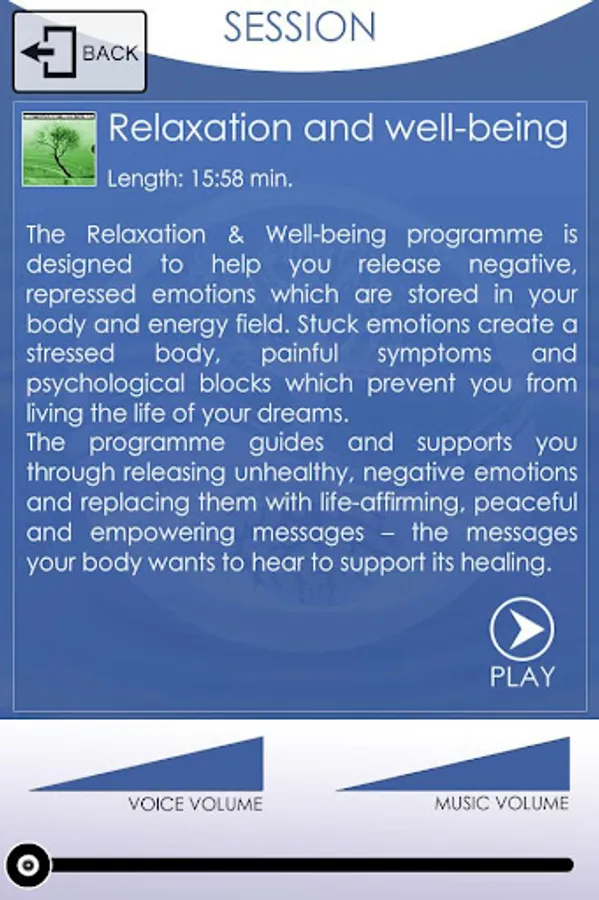 Note: This app offers two free audio sessions. One is a full relaxation and well-being meditation, the other one is an introduction explaining how to get the best benefits from it. Those two sessions are our gift to you -- no ads, no annoying reminders, no limited uses: just plain free! If you want to explore this healing method further, the app gives you access to a wide range of powerful meditations covering many topics, that you can unlock and download for a small fee (see full list below).