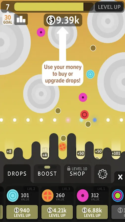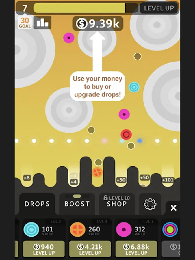 - Upgrade or buy new drops to earn more in-game money