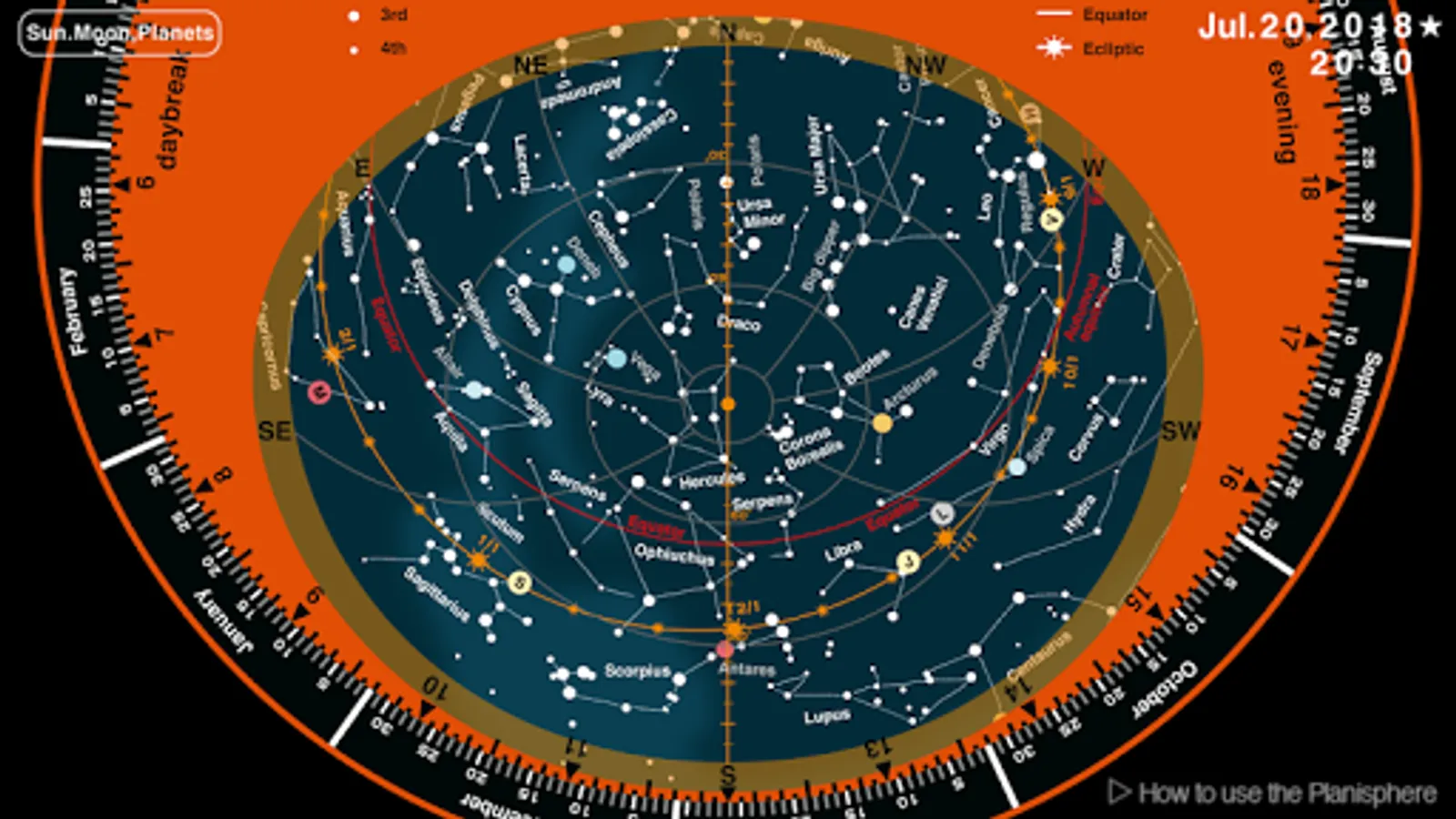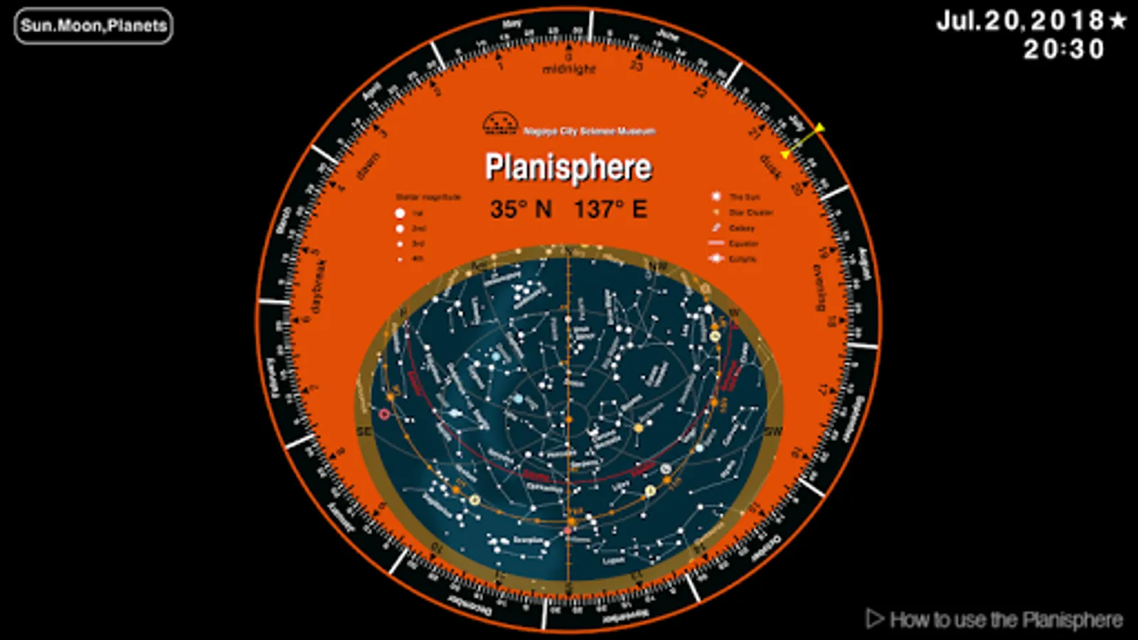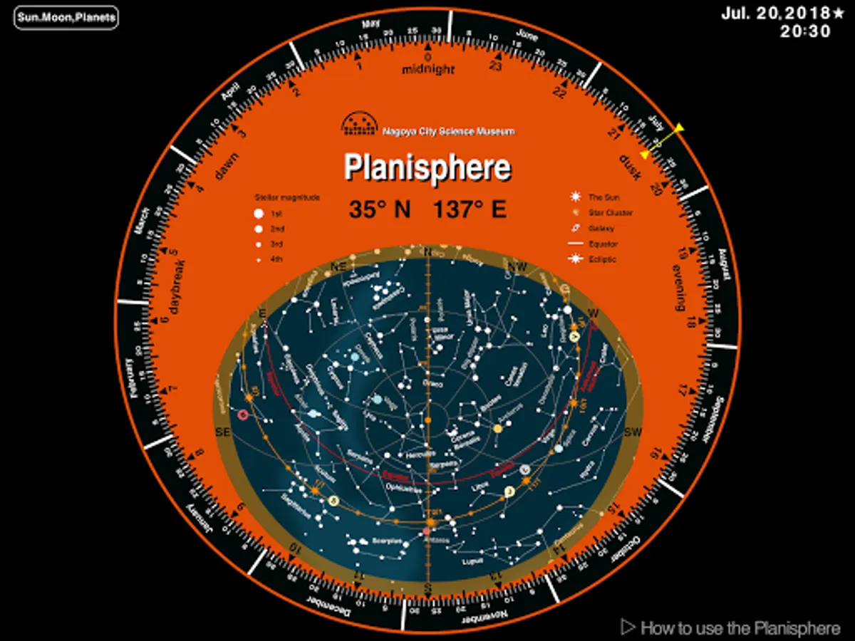 The planetarium curators of Nagoya City Science Museum have originally designed the Planisphere app. Many people know how to use the planisphere, because we learn it at elementary school. This is the planisphere of the era of IT which added the advantage as an app, with the plain usage of the planisphere printed on paper and plastic. Please look up at the real starry sky with this Planisphere app.