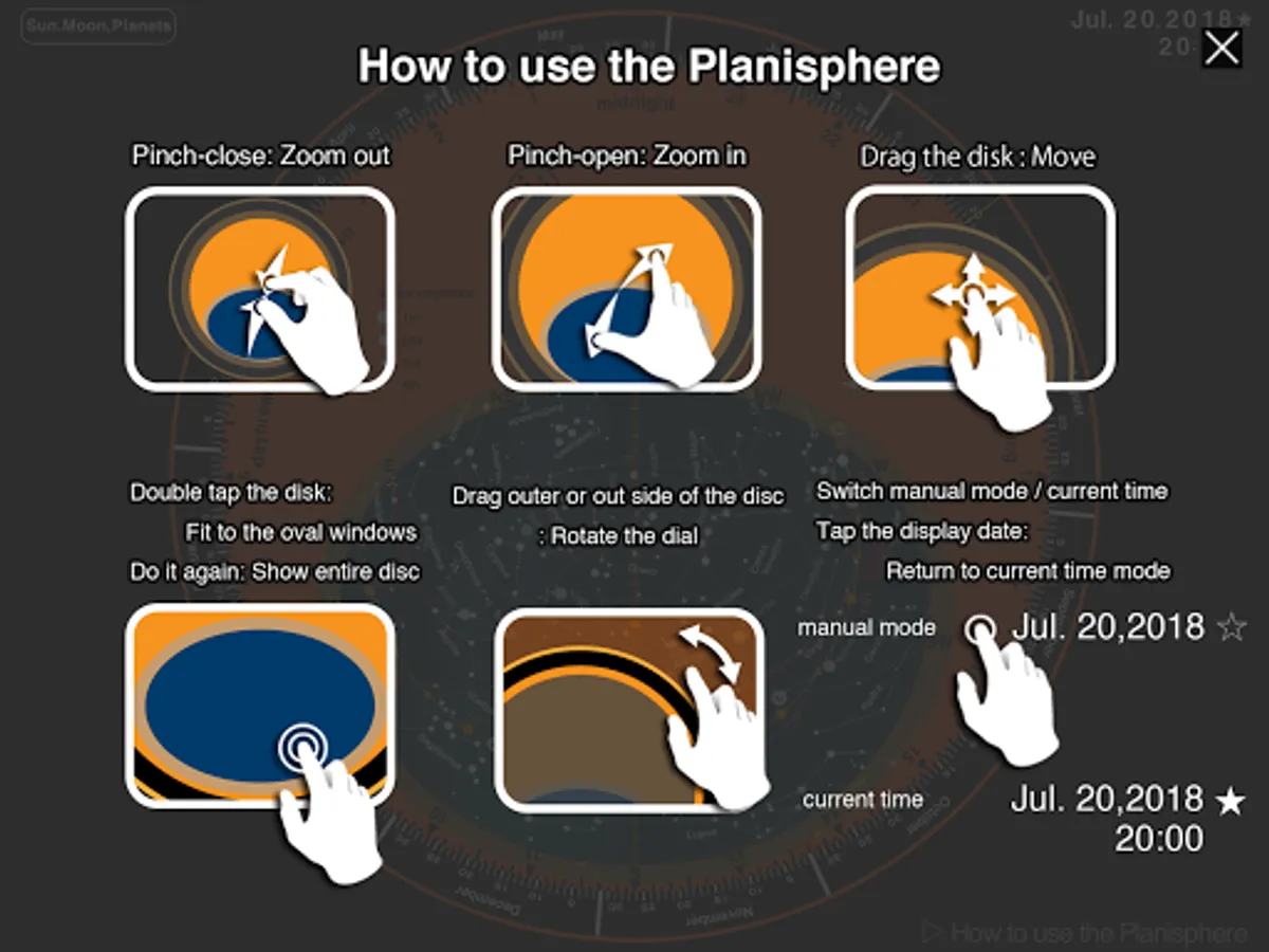 ・ Friendly to any ages: It is difficult to see small letters in a dark place. You can freely zoom in and out with the fingertips on the Planisphere app. Furthermore, it is easier to see than a printed planisphere, since the screen of smart phone or tablet have a light.