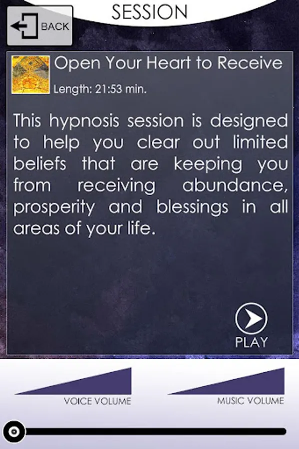 Note: This app offers two free audio sessions. One is a full guided meditation to attract abundance into your life, the other one is an introduction explaining how to get the best benefits from it. Those two sessions are our gift to you -- no ads, no annoying reminders, no limited uses: just plain free! If you want to explore this healing method further, the app gives you access to a wide range of powerful meditations and hypnosis sessions covering many topics, that you can unlock and download for a small fee.