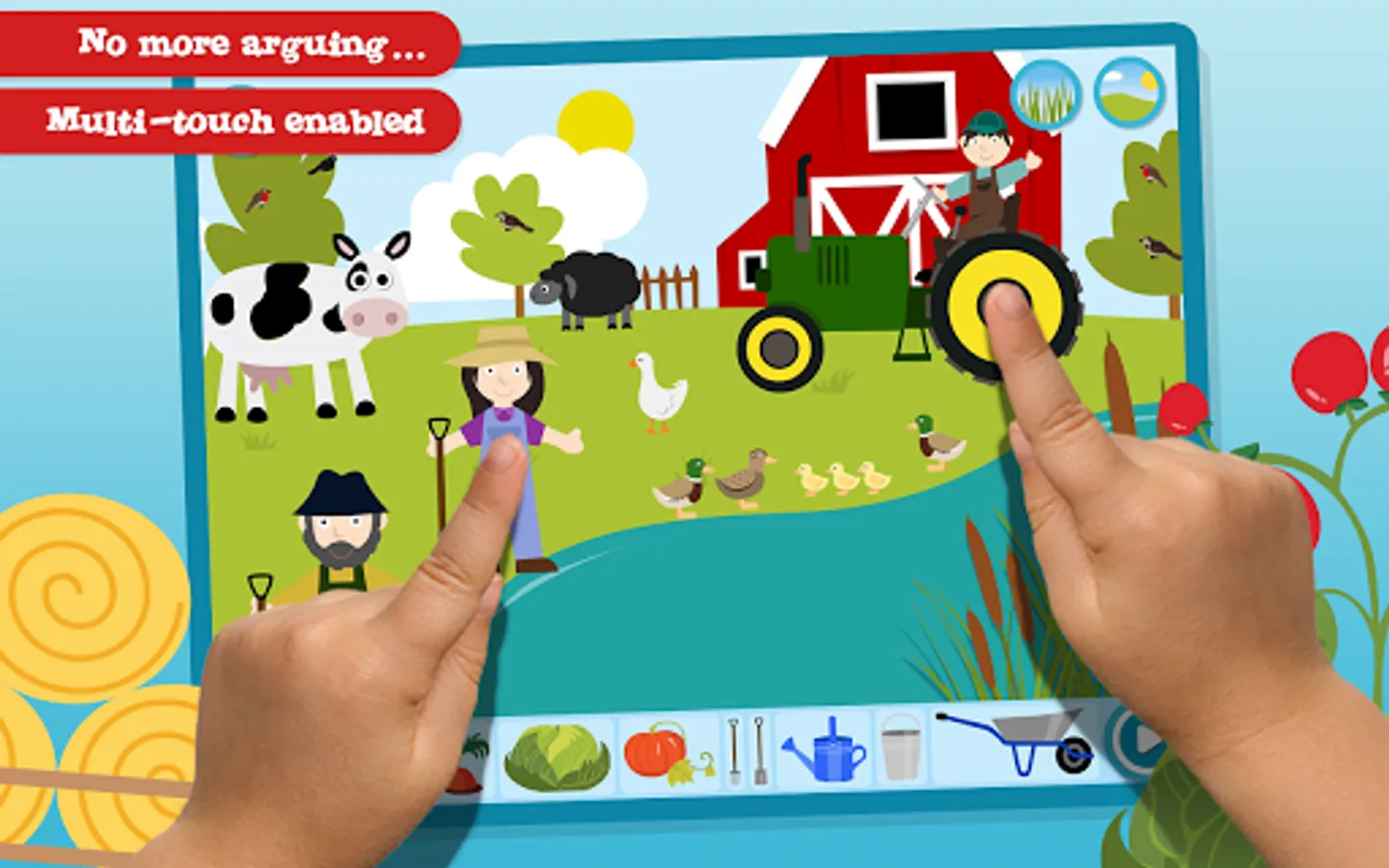The game features typical items found on a farm, such as people, animals, fruit, vegetables, equipment and machinery. By dragging and dropping these digital, animated ‘stickers’ onto the different backgrounds available, your child can create a large number of unique scenes. A clear voice-over reads the name of each item aloud, and is accompanied by fun animations and sound effects where possible.