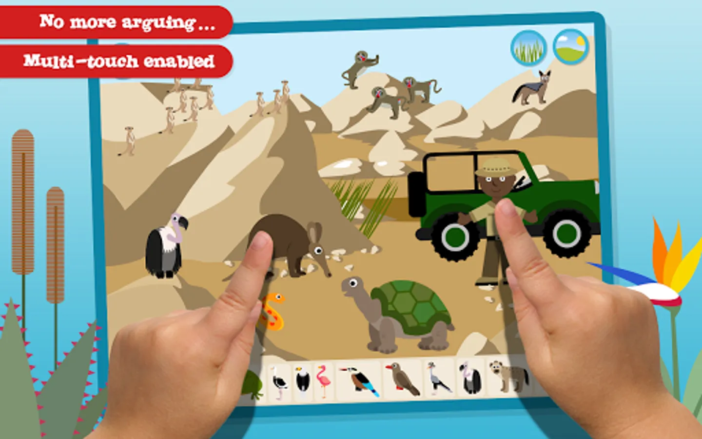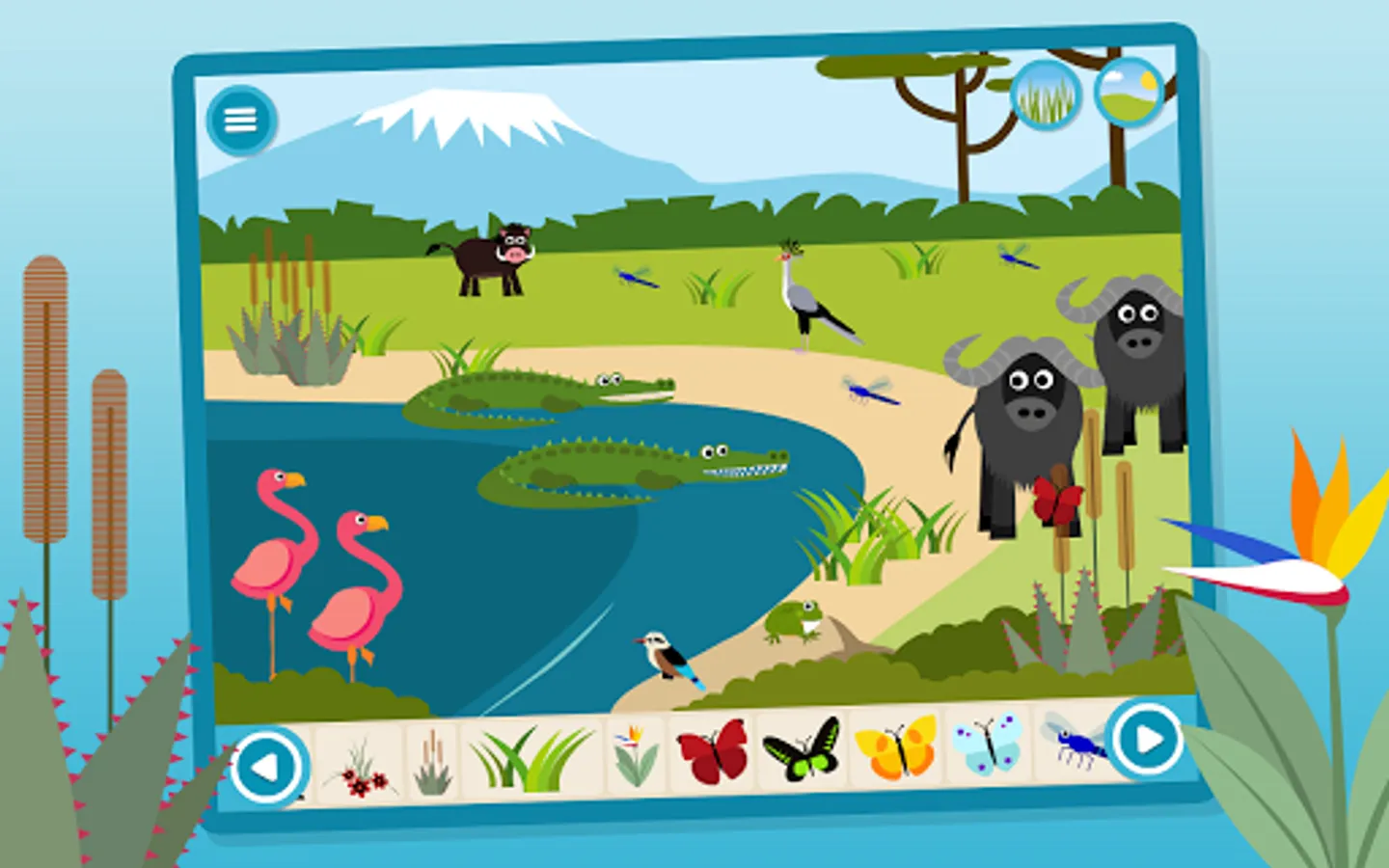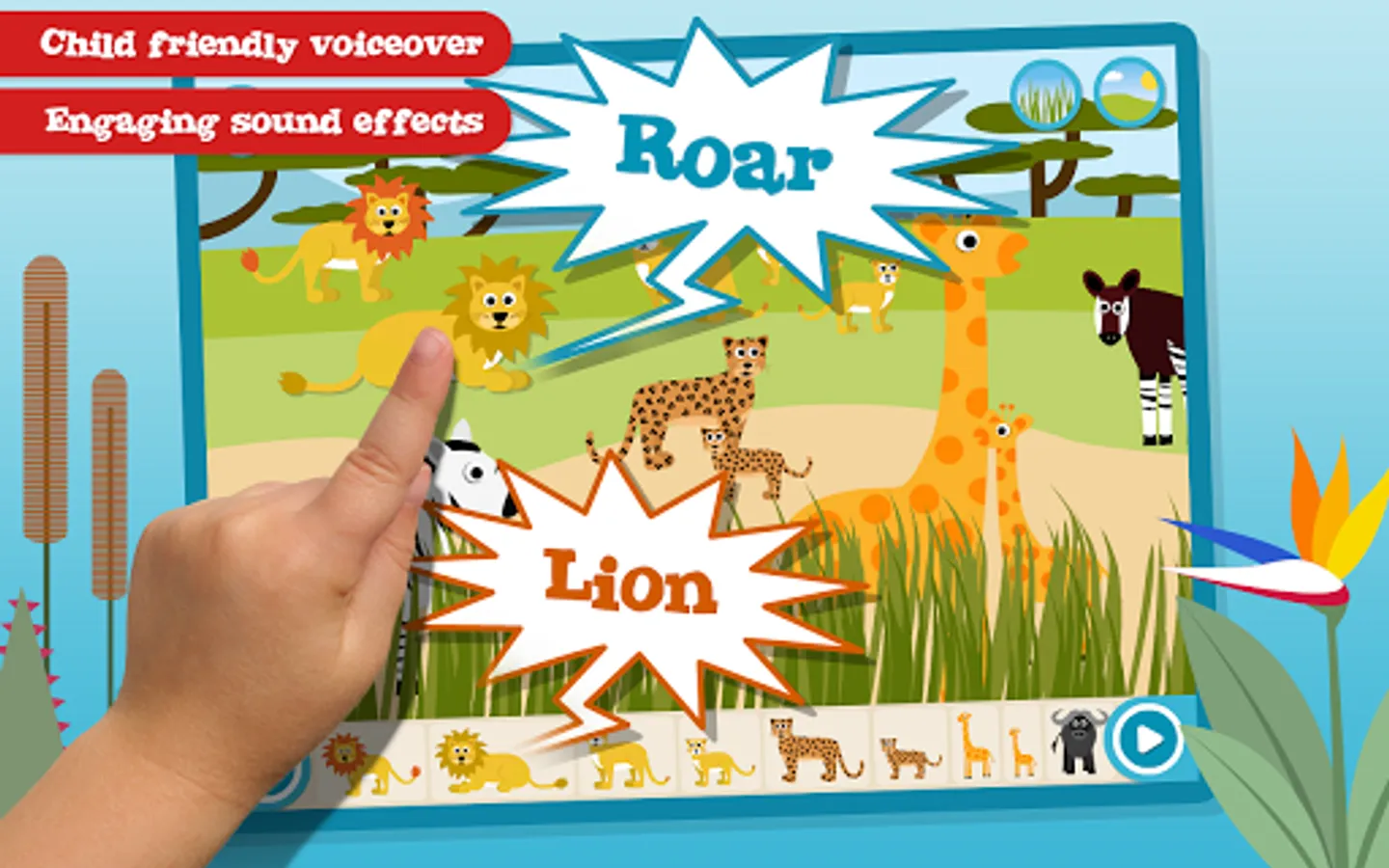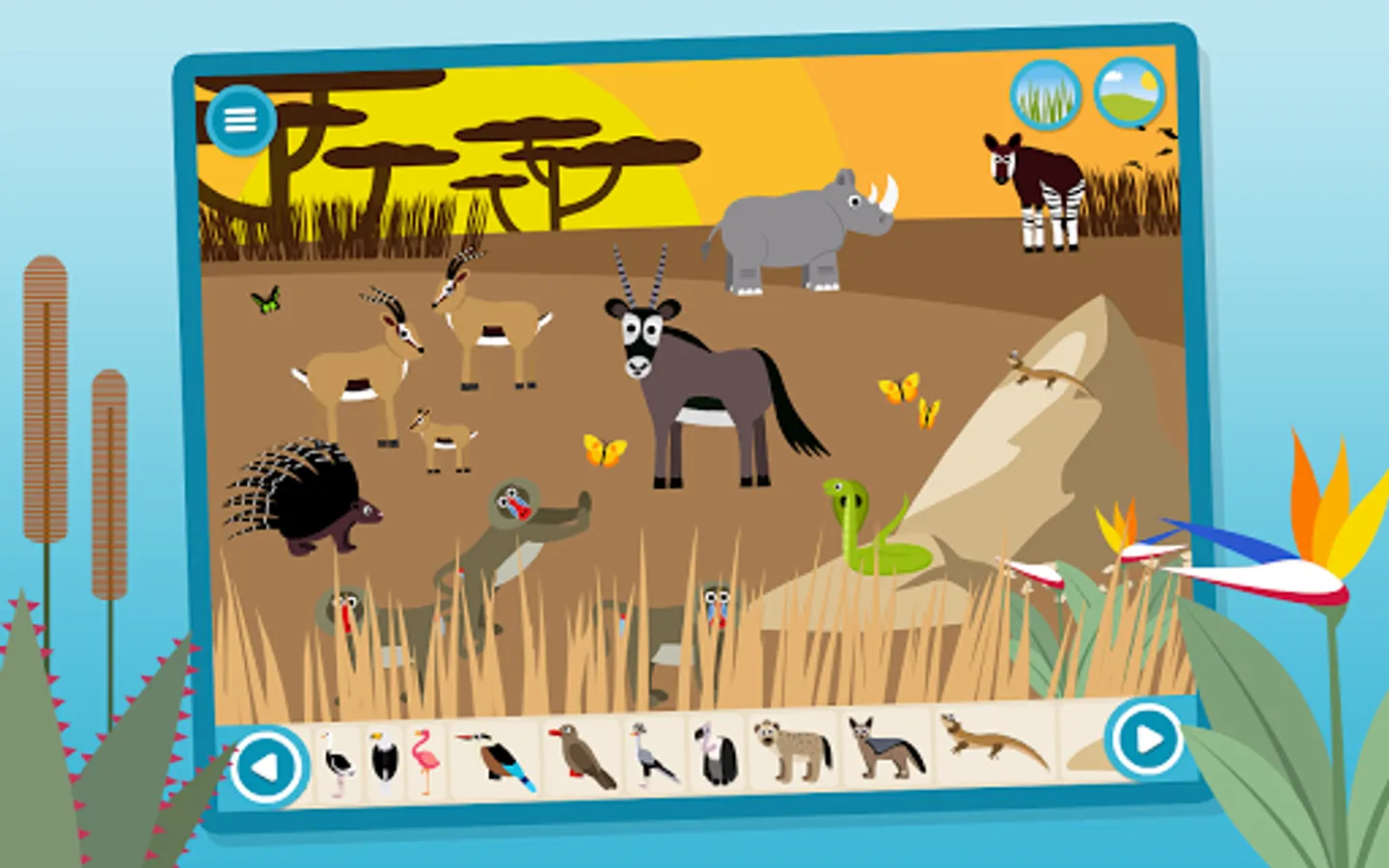 The game features typical items found on safari, such as people, mammals, reptiles, birds and plants. By dragging and dropping these digital, animated ‘stickers’ onto the different backgrounds available, your child can create a large number of unique scenes. A clear voice-over reads the name of each item aloud, and is accompanied by fun animations and sound effects where possible.