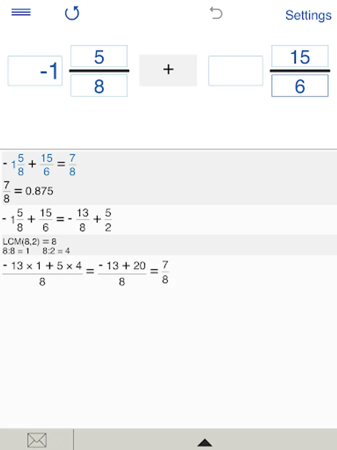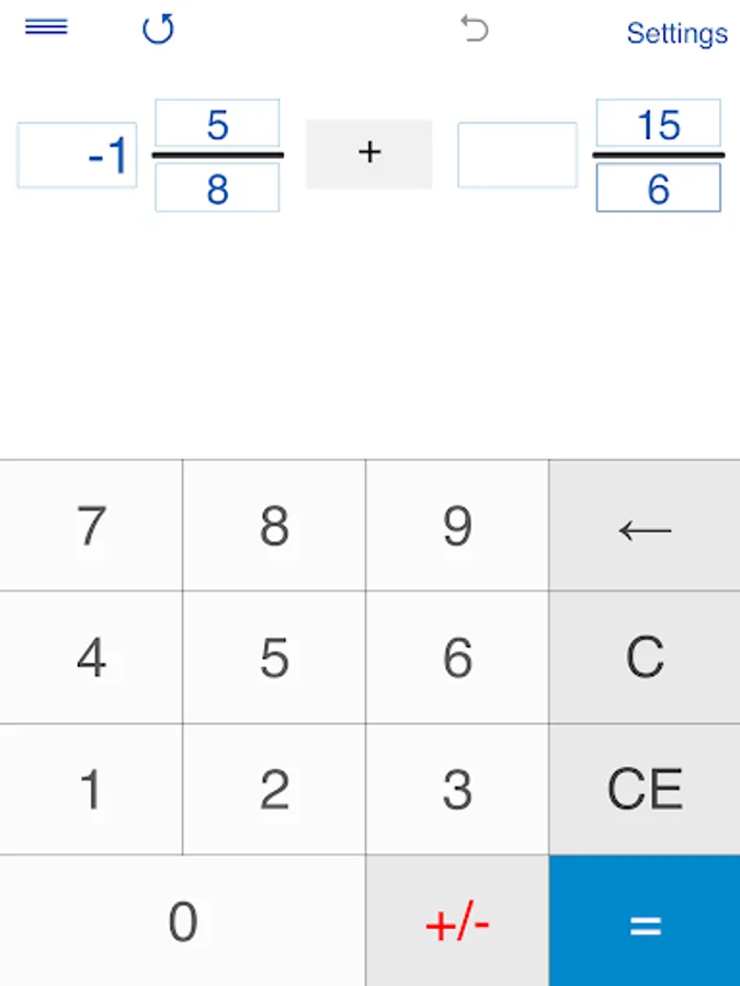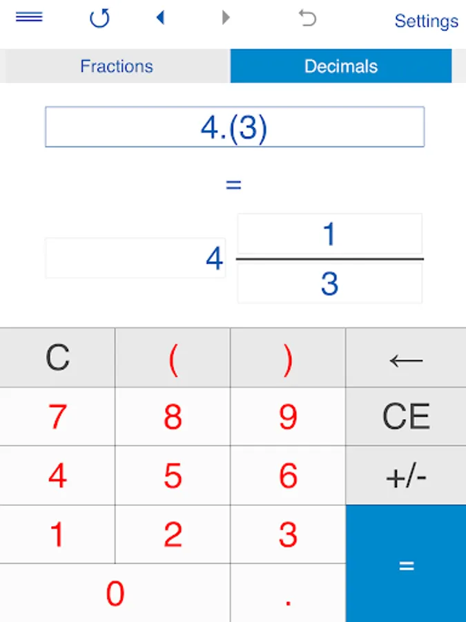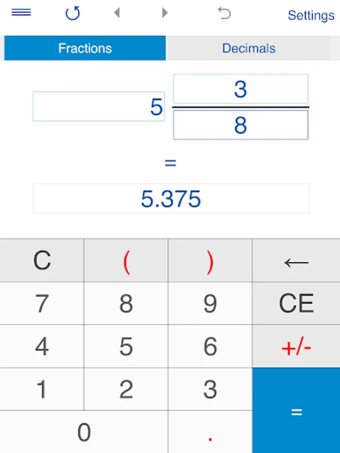 - To convert a fraction to a decimal number, tap ‘Fractions', input a fraction or a mixed number and tap "=".