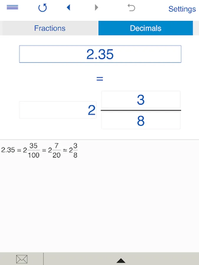 - To convert a decimal number to a fraction, tap ‘Decimals’, enter a decimal number using the decimal point "." as separator (eg. 1.23) and tap "=".