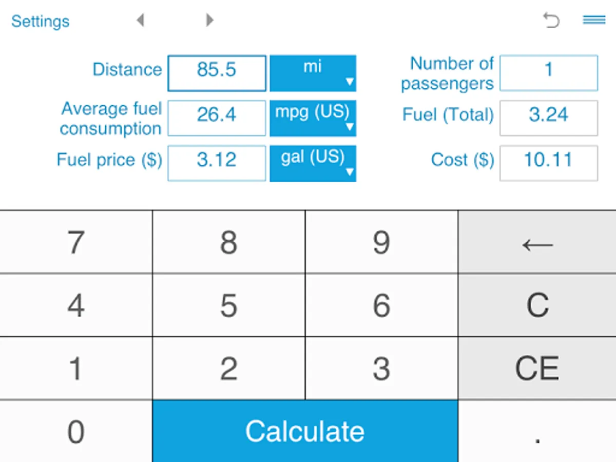 The app does calculations in imperial (MPG US or MPG UK) and metric (km/L or L/100 km)) units.